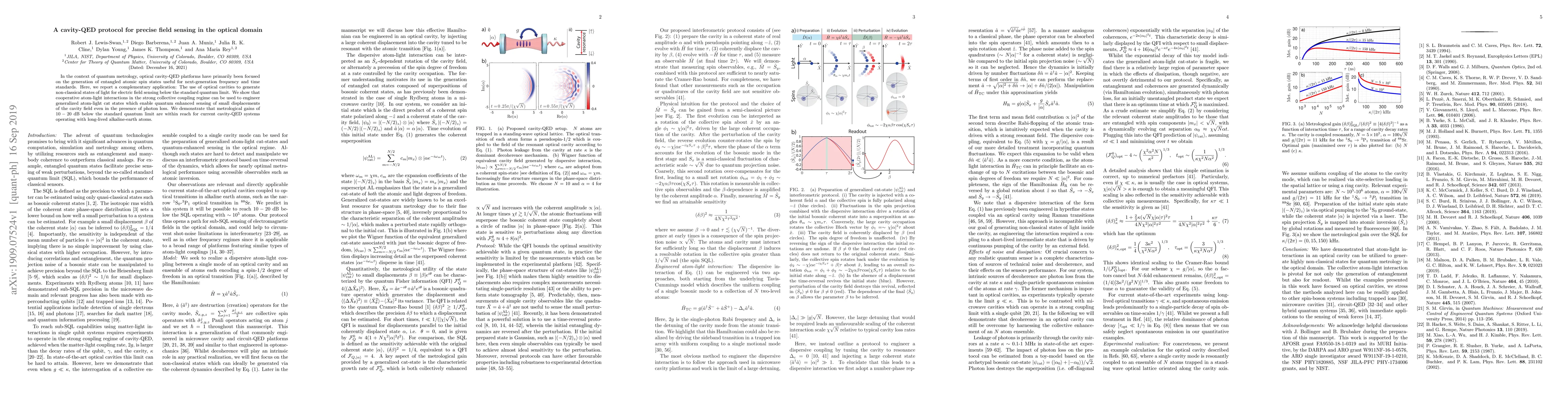 In the context of quantum metrology, optical cavity-QED platforms have primarily been focused on the generation of entangled atomic spin states useful for next-generation frequency and time standards. Here, we report a complementary application: The use of optical cavities to generate non-classical states of light for electric field sensing below the standard quantum limit. We show that cooperative atom-light interactions in the strong collective coupling regime can be used to engineer generalized atom-light cat states which enable quantum enhanced sensing of small displacements of the cavity field even in the presence of photon loss. We demonstrate that metrological gains of 10-20 dB below the standard quantum limit are within reach for current cavity-QED systems operating with long-lived alkaline-earth atoms.