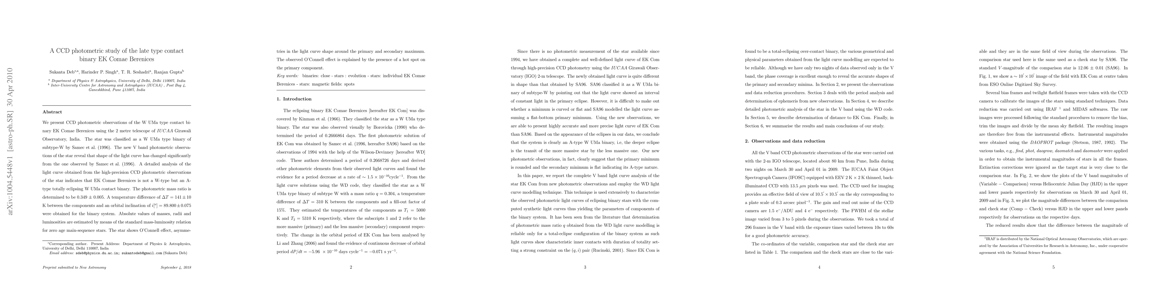 This paper reports CCD photometric observations of the contact binary EK Comae Berenices, revealing a significant change in its light curve and classifying it as an A-type totally eclipsing W UMa system. The study determined the photometric mass ratio, temperature difference, and orbital inclination, and identified the presence of a hot spot causing the O'Connell effect.