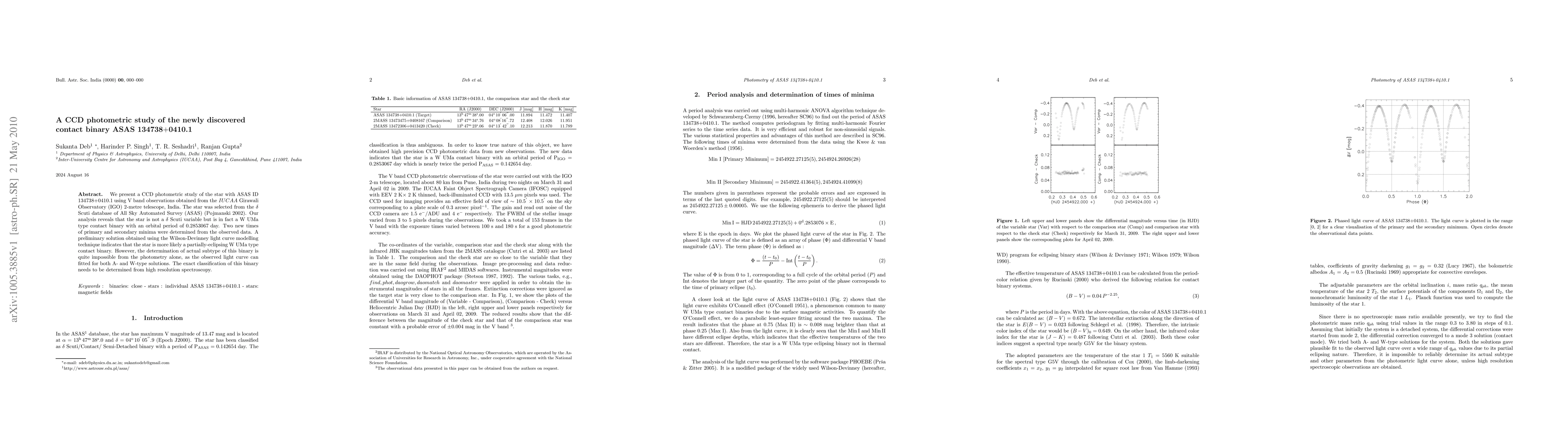 We present a CCD photometric study of the star with ASAS ID 134738 + 0410.1 using V band observations obtained from the $IUCAA$ Girawali Observatory (IGO) 2-metre telescope, India. The star was selected from the $\delta$ Scuti database of All Sky Automated Survey (ASAS) (Pojmanski 2002). Our analysis reveals that the star is not a $\delta$ Scuti variable but is in fact a W UMa type contact binary with an orbital period of 0.2853067 day. Two new times of primary and secondary minima were determined from the observed data. A preliminary solution obtained using the Wilson-Devinney light curve modelling technique indicates that the star is more likely a partially-eclipsing W UMa type contact binary. However, the determination of actual subtype of this binary is quite impossible from the photometry alone, as the observed light curve can fitted for both A- and W-type solutions. The exact classification of this binary needs to be determined from high resolution spectroscopy.