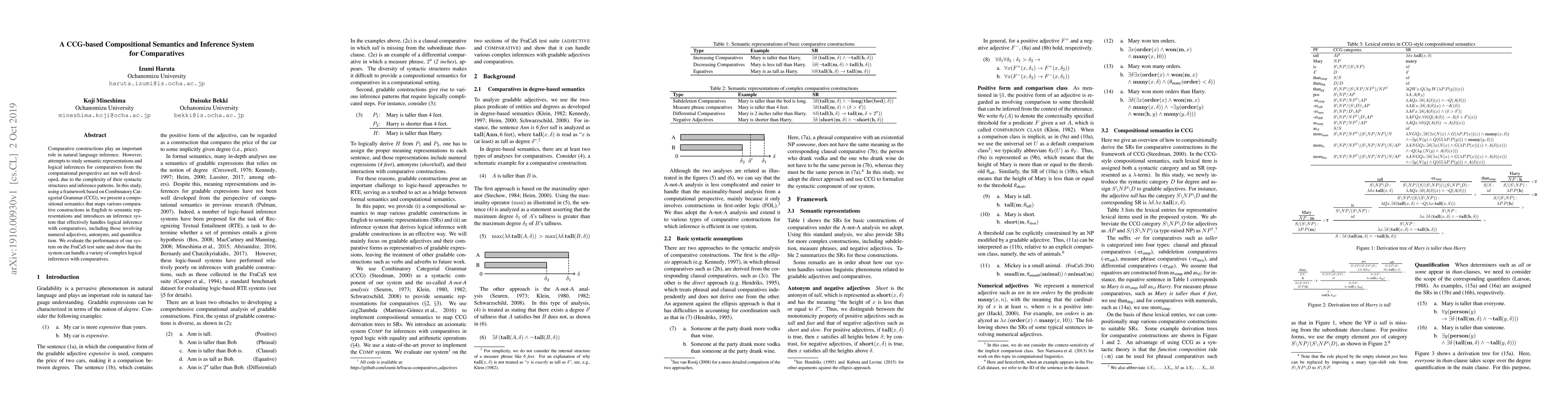This paper introduces a CCG-based compositional semantics and inference system for comparatives in natural language, addressing the complexities of their syntactic structures and logical inferences. The system effectively handles comparatives involving numerals, antonyms, and quantification, demonstrating its effectiveness through evaluation on the FraCaS test suite.