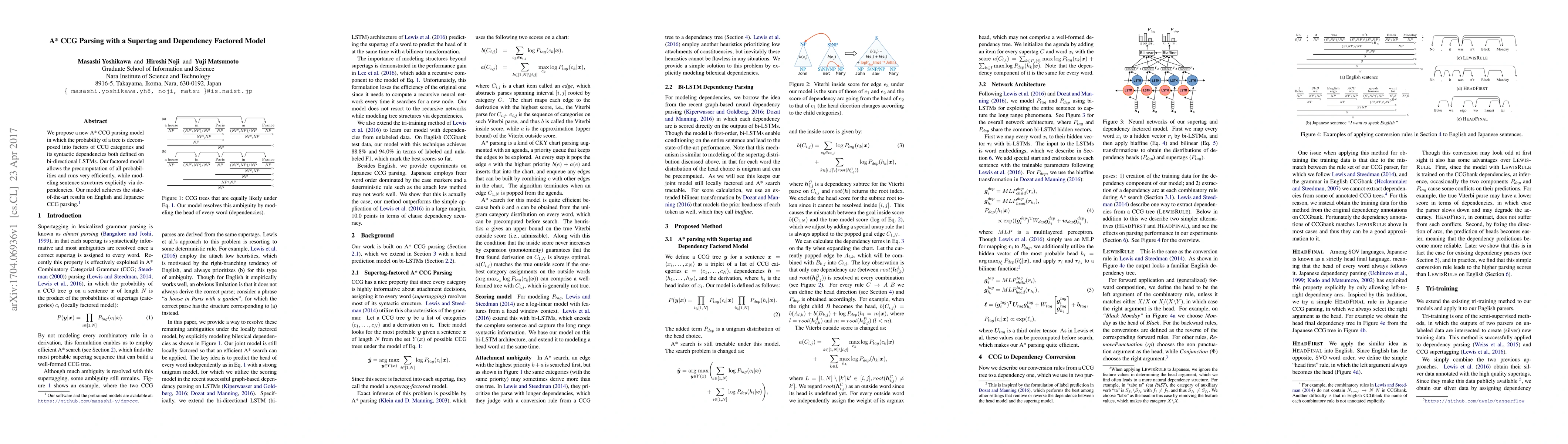This paper introduces an efficient A* CCG parsing model that factors probabilities into CCG categories and syntactic dependencies, utilizing bi-directional LSTMs. The proposed factored model achieves state-of-the-art performance in parsing English and Japanese.