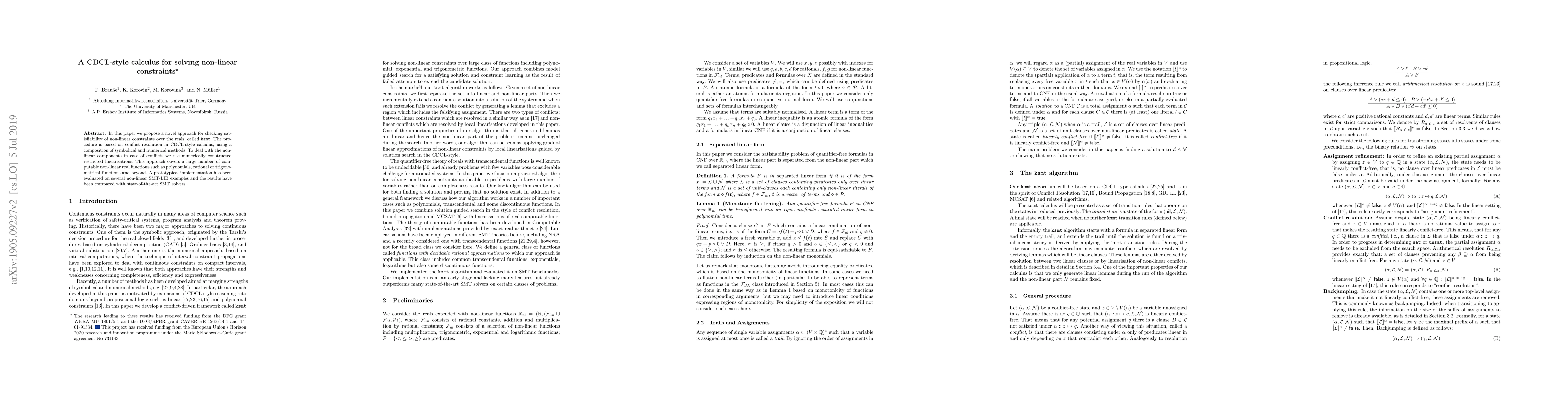 This paper introduces a CDCL-style method called ksmt for solving satisfiability of non-linear constraints over reals, combining symbolic and numerical techniques. The approach uses restricted linearizations for conflict resolution and has been tested against state-of-the-art SMT solvers.