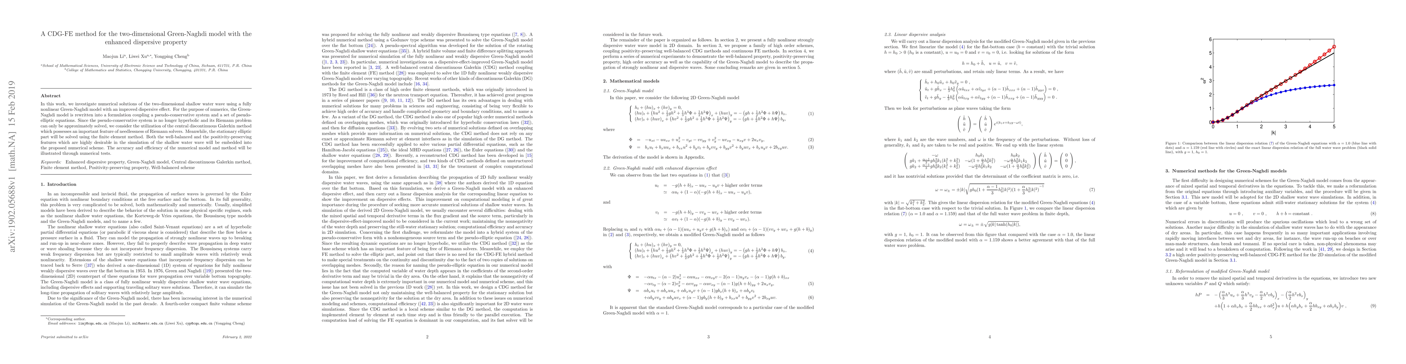 This paper proposes a CDG-FE method for solving the two-dimensional Green-Naghdi model, focusing on enhanced dispersive properties in shallow water waves. The method combines central discontinuous Galerkin for the pseudo-conservative system and finite element for the pseudo-elliptic equations, ensuring well-balancedness and positivity-preserving features.