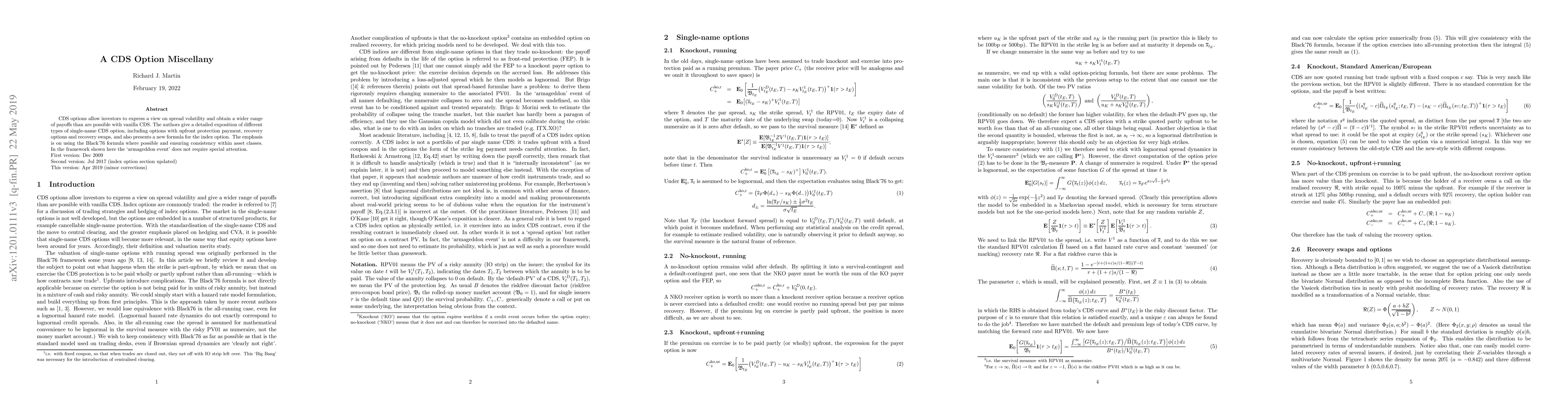 CDS options allow investors to express a view on spread volatility and obtain a wider range of payoffs than are possible with vanilla CDS. We give a detailed exposition of different types of single-name CDS option, including options with upfront protection payment, recovery options and recovery swaps, and also presents a new formula for the index option. The emphasis is on using the Black-76 formula where possible and ensuring consistency within asset classes. In the framework shown here the `armageddon event' does not require special attention.
