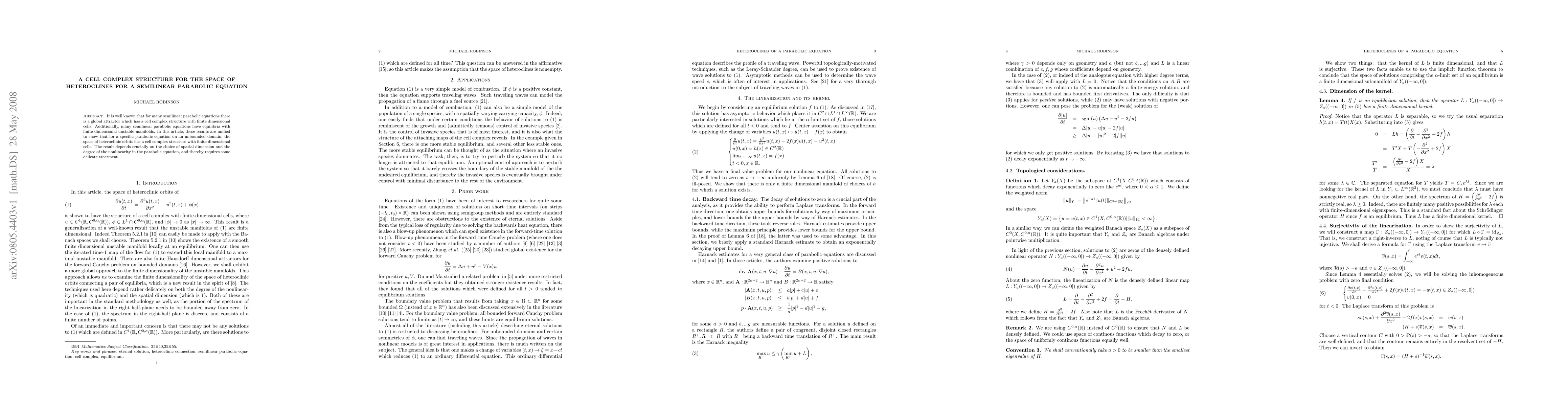 It is well known that for many semilinear parabolic equations there is a global attractor which has a cell complex structure with finite dimensional cells. Additionally, many semilinear parabolic equations have equilibria with finite dimensional unstable manifolds. In this article, these results are unified to show that for a specific parabolic equation on an unbounded domain, the space of heteroclinic orbits has a cell complex structure with finite dimensional cells. The result depends crucially on the choice of spatial dimension and the degree of the nonlinearity in the parabolic equation, and thereby requires some delicate treatment.