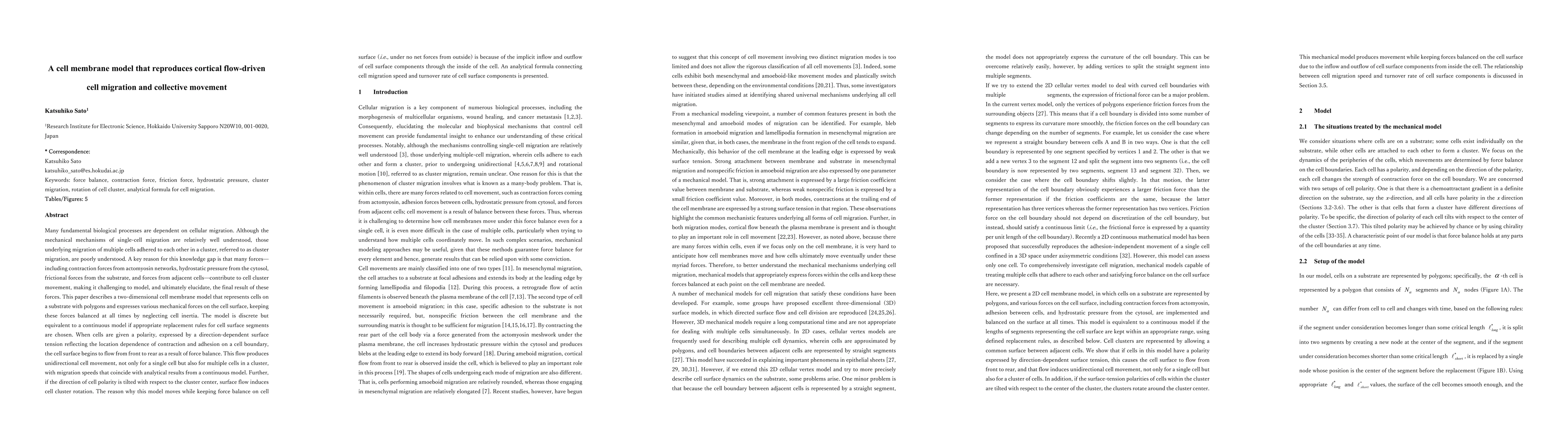 This paper presents a two-dimensional cell membrane model that simulates cortical flow-driven cell migration and collective movement in clusters, balancing mechanical forces without considering cell inertia. The model's surface tension polarity induces directional flow, enabling both single-cell and cluster migration, with speeds matching analytical predictions from continuous models.