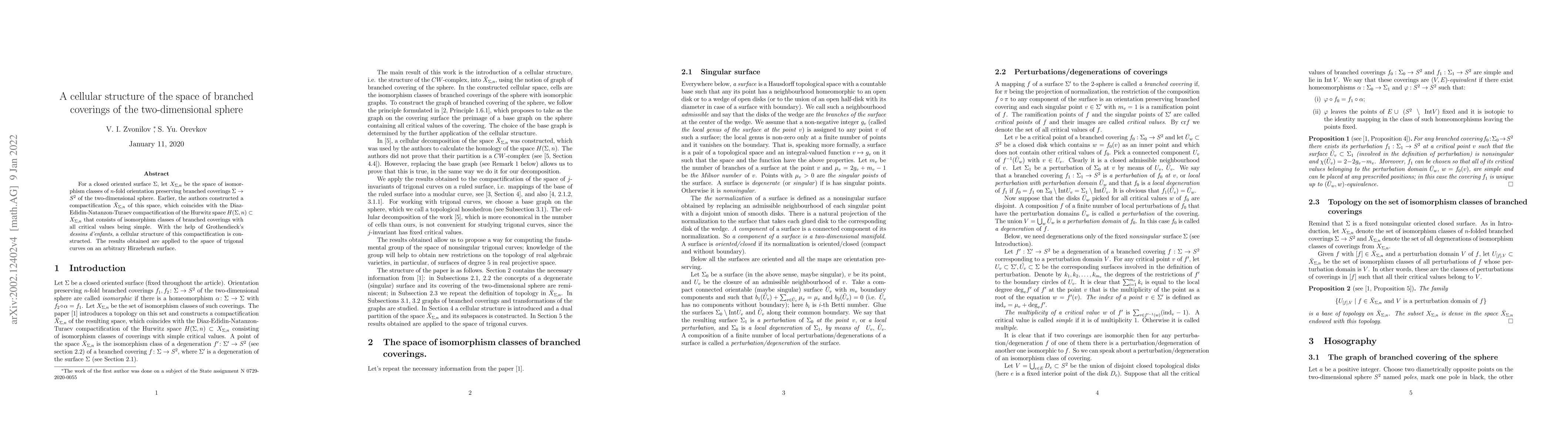 This paper constructs a compactification of the space of $n$-fold branched coverings of the two-dimensional sphere over a closed oriented surface, utilizing Grothendieck's dessins d'enfants to develop a cell structure. The results are then applied to study the space of trigonal curves on a Hirzebruch surface.