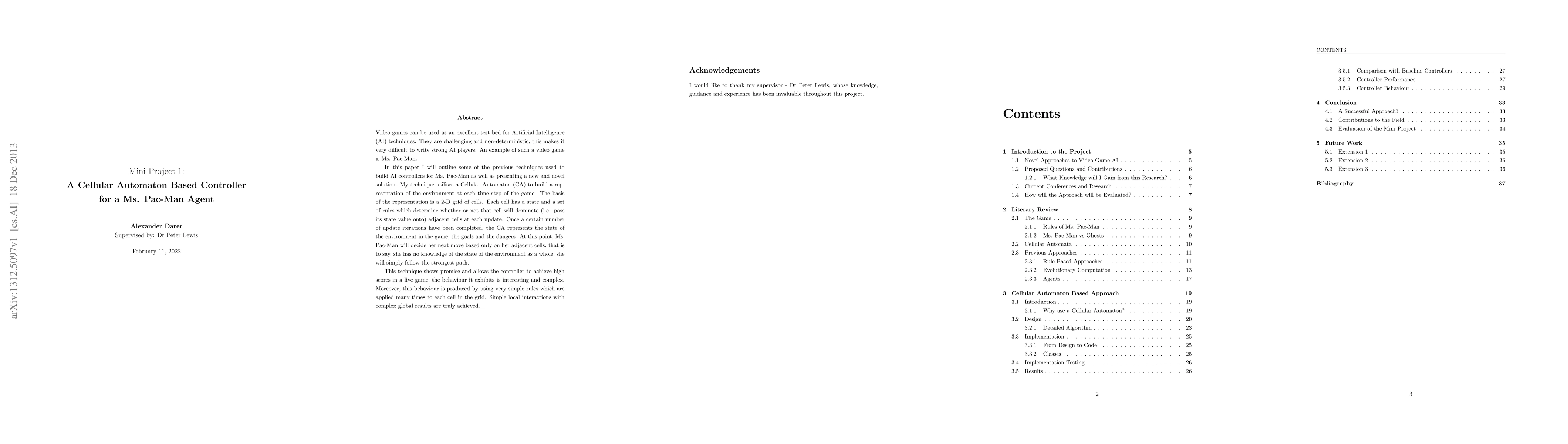 Video games can be used as an excellent test bed for Artificial Intelligence (AI) techniques. They are challenging and non-deterministic, this makes it very difficult to write strong AI players. An example of such a video game is Ms. Pac-Man. In this paper we will outline some of the previous techniques used to build AI controllers for Ms. Pac-Man as well as presenting a new and novel solution. My technique utilises a Cellular Automaton (CA) to build a representation of the environment at each time step of the game. The basis of the representation is a 2-D grid of cells. Each cell has a state and a set of rules which determine whether or not that cell will dominate (i.e. pass its state value onto) adjacent cells at each update. Once a certain number of update iterations have been completed, the CA represents the state of the environment in the game, the goals and the dangers. At this point, Ms. Pac-Man will decide her next move based only on her adjacent cells, that is to say, she has no knowledge of the state of the environment as a whole, she will simply follow the strongest path. This technique shows promise and allows the controller to achieve high scores in a live game, the behaviour it exhibits is interesting and complex. Moreover, this behaviour is produced by using very simple rules which are applied many times to each cell in the grid. Simple local interactions with complex global results are truly achieved.