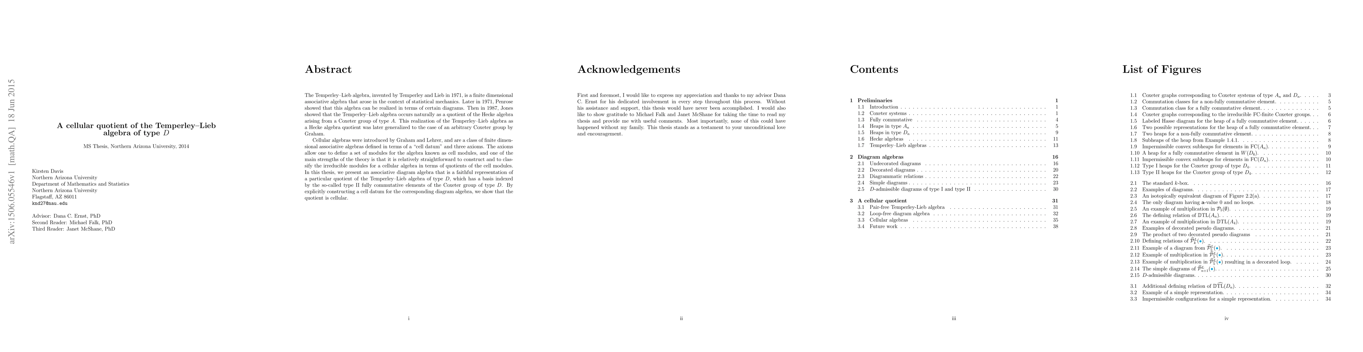 The Temperley--Lieb algebra, invented by Temperley and Lieb in 1971, is a finite dimensional associative algebra that arose in the context of statistical mechanics. Later in 1971, Penrose showed that this algebra can be realized in terms of certain diagrams. Then in 1987, Jones showed that the Temperley--Lieb algebra occurs naturally as a quotient of the Hecke algebra arising from a Coxeter group of type $A$. This realization of the Temperley--Lieb algebra as a Hecke algebra quotient was later generalized to the case of an arbitrary Coxeter group by Graham. Cellular algebras were introduced by Graham and Lehrer, and are a class of finite dimensional associative algebras defined in terms of a "cell datum" and three axioms. The axioms allow one to define a set of modules for the algebra known as cell modules, and one of the main strengths of the theory is that it is relatively straightforward to construct and to classify the irreducible modules for a cellular algebra in terms of quotients of the cell modules. In this thesis, we present an associative diagram algebra that is a faithful representation of a particular quotient of the Temperley--Lieb algebra of type $D$, which has a basis indexed by the so-called type II fully commutative elements of the Coxeter group of type $D$. By explicitly constructing a cell datum for the corresponding diagram algebra, we show that the quotient is cellular.