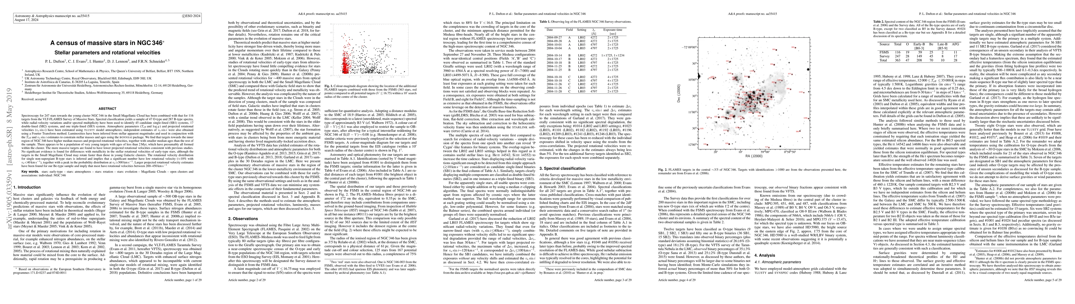 This study combines spectroscopy of 363 stars in NGC 346 to identify and classify 47 O-type and 287 B-type stars, estimating their atmospheric parameters, rotational velocities, and masses. It reveals higher median masses and rotational velocities in the inner region, with a population of very young stars, and suggests that Be-type stars have rotational velocities between 200-450 km/s.