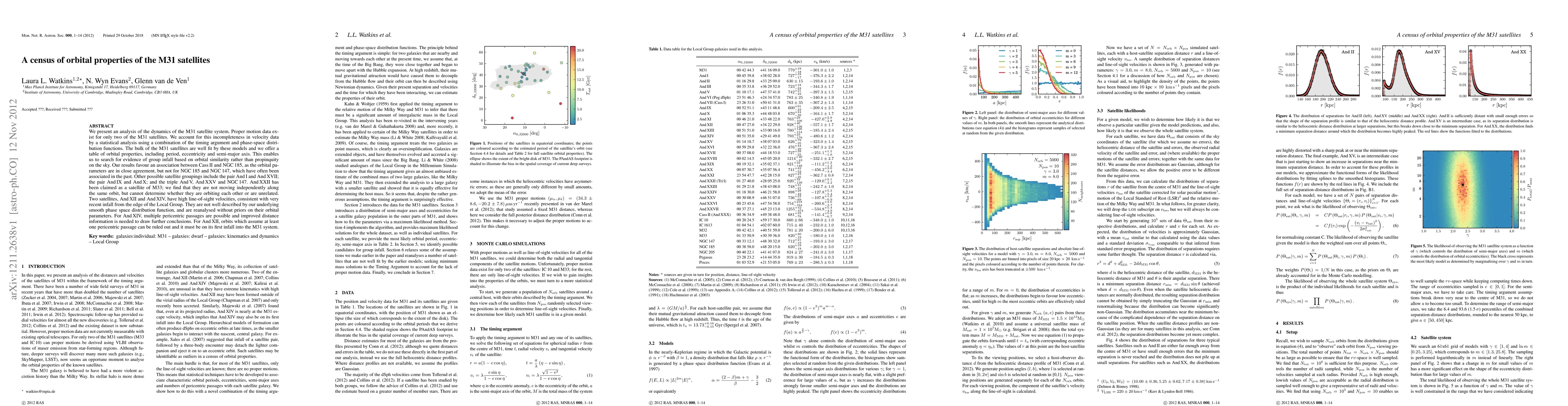 We present an analysis of the dynamics of the M31 satellite system. Proper motion data exist for only two of the M31 satellites. We account for this incompleteness in velocity data by a statistical analysis using a combination of the timing argument and phase-space distribution functions. The bulk of the M31 satellites are well fit by these models and we offer a table of orbital properties, including period, eccentricity and semi-major axis. This enables us to search for evidence of group infall based on orbital similarity rather than propinquity on the sky. Our results favour an association between Cass II and NGC 185, as the orbital parameters are in close agreement, but not for NGC 185 and NGC 147, which have often been associated in the past. Other possible satellite groupings include the pair And I and And XVII; the pair And IX and And X; and the triple And V, And XXV and NGC 147. And XXII has been claimed as a satellite of M33; we find that they are not moving independently along the same orbit, but cannot determine whether they are orbiting each other or are unrelated. Two satellites, And XII and And XIV, have high line-of-sight velocities, consistent with very recent infall from the edge of the Local Group. They are not well described by our underlying smooth phase space distribution function, and are reanalysed without priors on their orbital parameters. For And XIV, multiple pericentric passages are possible and improved distance information is needed to draw further conclusions. For And XII, orbits which assume at least one pericentric passage can be ruled out and it must be on its first infall into the M31 system.