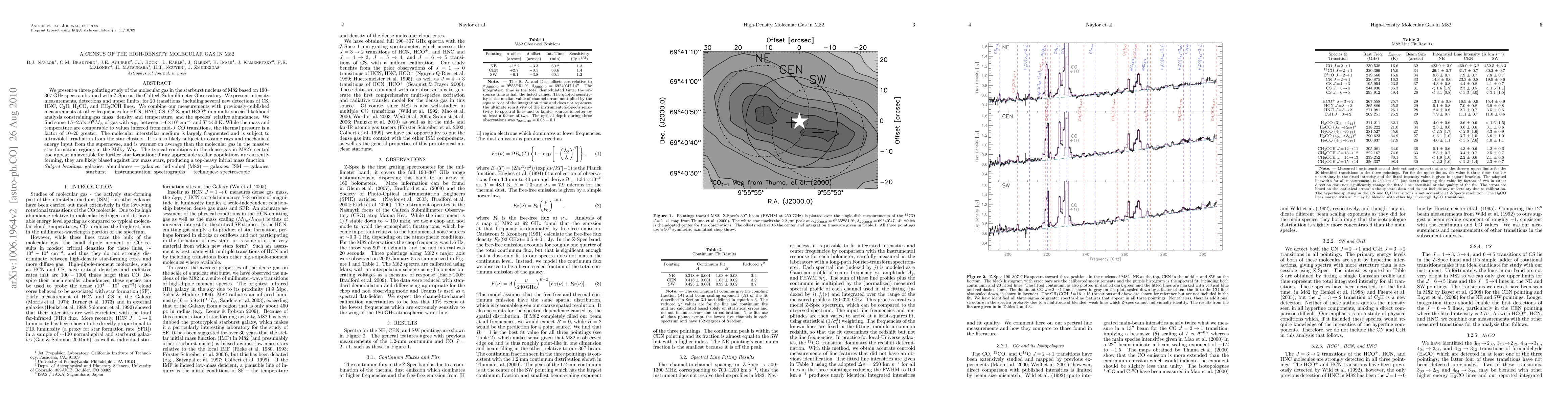 We present a three-pointing study of the molecular gas in the starburst nucleus of M82 based on 190 - 307 GHz spectra obtained with Z-Spec at the Caltech Submillimeter Observatory. We present intensity measurements, detections and upper limits, for 20 transitions, including several new detections of CS, HNC, C2H, H2CO, and CH3CCH lines. We combine our measurements with previously-published measurements at other frequencies for HCN, HNC, CS, C34S, and HCO+ in a multi-species likelihood analysis constraining gas mass, density and temperature, and the species' relative abundances. We find some 1.7 - 2.7 x 10^8 M_sun of gas with n_H2 between 1 - 6 x 10^4 cm^-3 and T > 50 K. While the mass and temperature are comparable to values inferred from mid-J CO transitions, the thermal pressure is a factor of 10 - 20 greater. The molecular interstellar medium is largely fragmented and is subject to ultraviolet irradiation from the star clusters. It is also likely subject to cosmic rays and mechanical energy input from the supernovae, and is warmer on average than the molecular gas in the massive star formation regions in the Milky Way. The typical conditions in the dense gas in M82's central kpc appear unfavorable for further star formation; if any appreciable stellar populations are currently forming, they are likely biased against low mass stars, producing a top-heavy initial mass function.