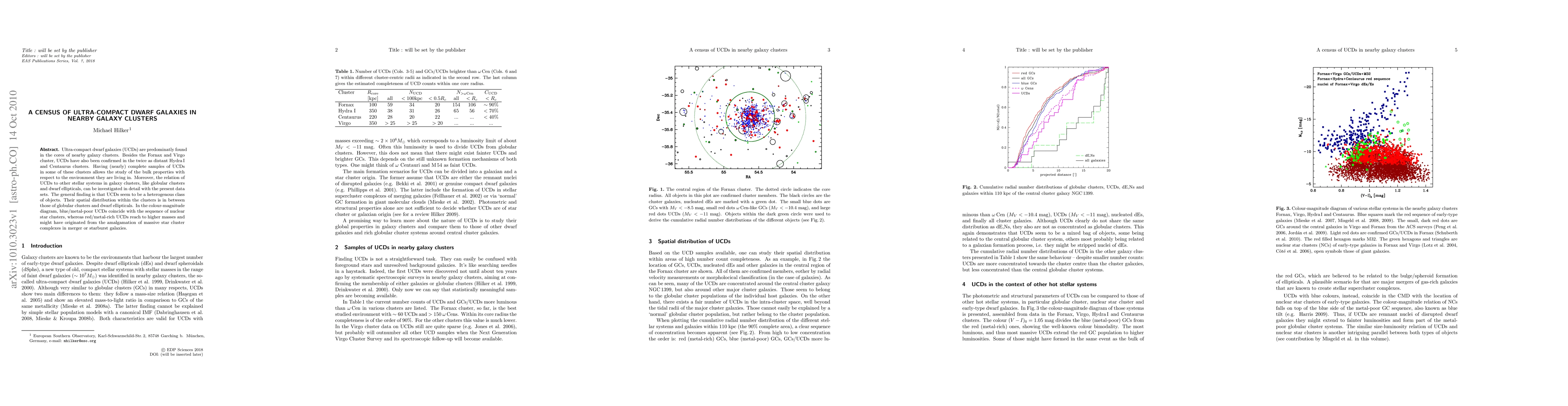 This paper conducts a census of ultra-compact dwarf galaxies (UCDs) in nearby galaxy clusters, finding they occupy an intermediate spatial distribution between globular clusters and dwarf ellipticals. UCDs show heterogeneity, with blue/metal-poor types aligning with nuclear star clusters and red/metal-rich types potentially originating from merged star clusters.