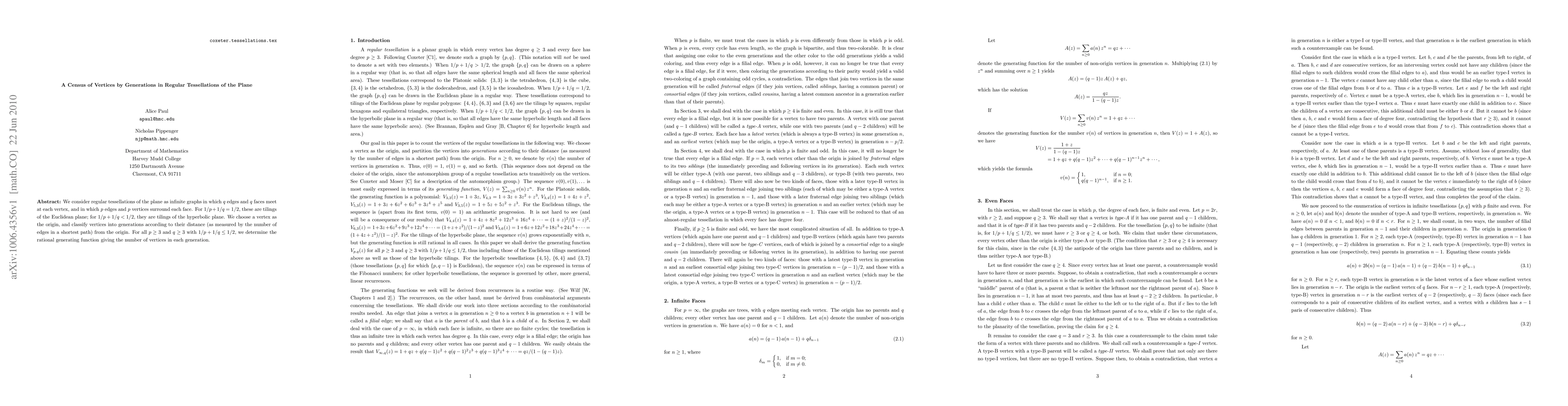 We consider regular tessellations of the plane as infinite graphs in which $q$ edges and $q$ faces meet at each vertex, and in which $p$ edges and $p$ vertices surround each face. For $1/p + 1/q = 1/2$, these are tilings of the Euclidean plane; for $1/p + 1/q < 1/2 $, they are tilings of the hyperbolic plane. We choose a vertex as the origin, and classify vertices into generations according to their distance (as measured by the number of edges in a shortest path) from the origin. For all $p\ge 3$ and $q \ge 3$ with $1/p + 1/q \le 1/2 $, we determine the rational generating function giving the number of vertices in each generation.
