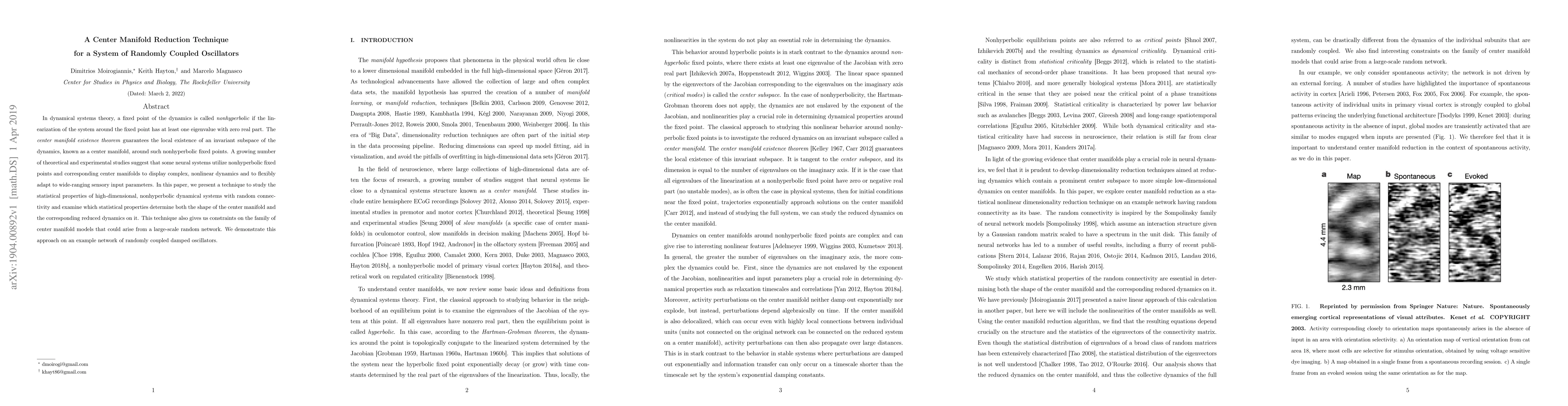 This paper introduces a method to analyze high-dimensional, nonhyperbolic dynamical systems with random connections, focusing on center manifolds. The technique identifies statistical properties influencing center manifold shape and dynamics, applied to a network of coupled oscillators, with implications for understanding complex neural system behaviors.