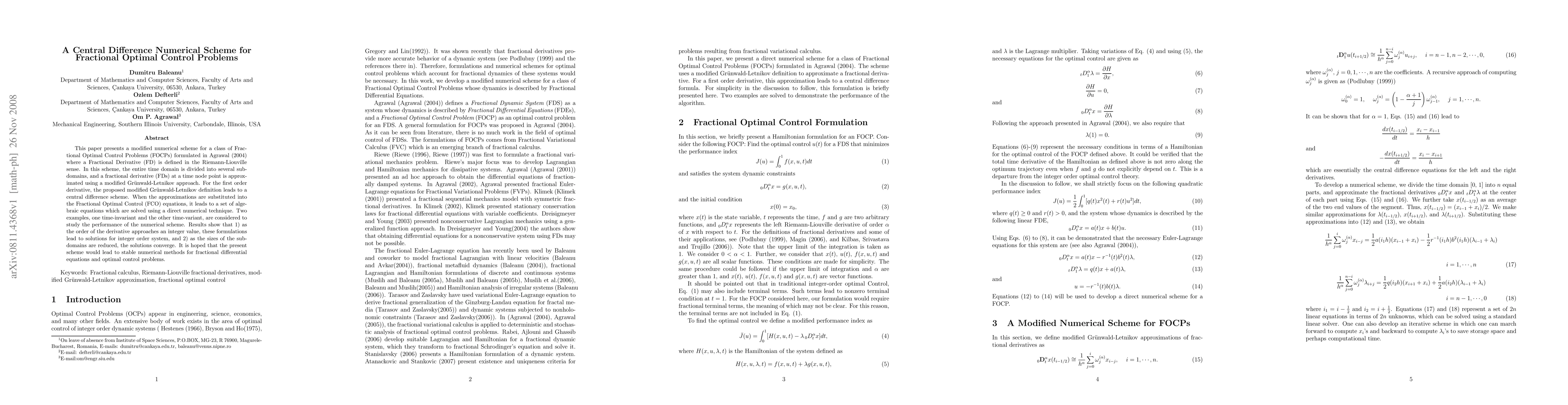 This paper introduces a central difference numerical scheme for solving Fractional Optimal Control Problems using a modified Grünwald-Letnikov approach. The scheme approximates fractional derivatives and leads to a set of algebraic equations, which are solved to demonstrate convergence and stability for both time-invariant and time-variant examples.