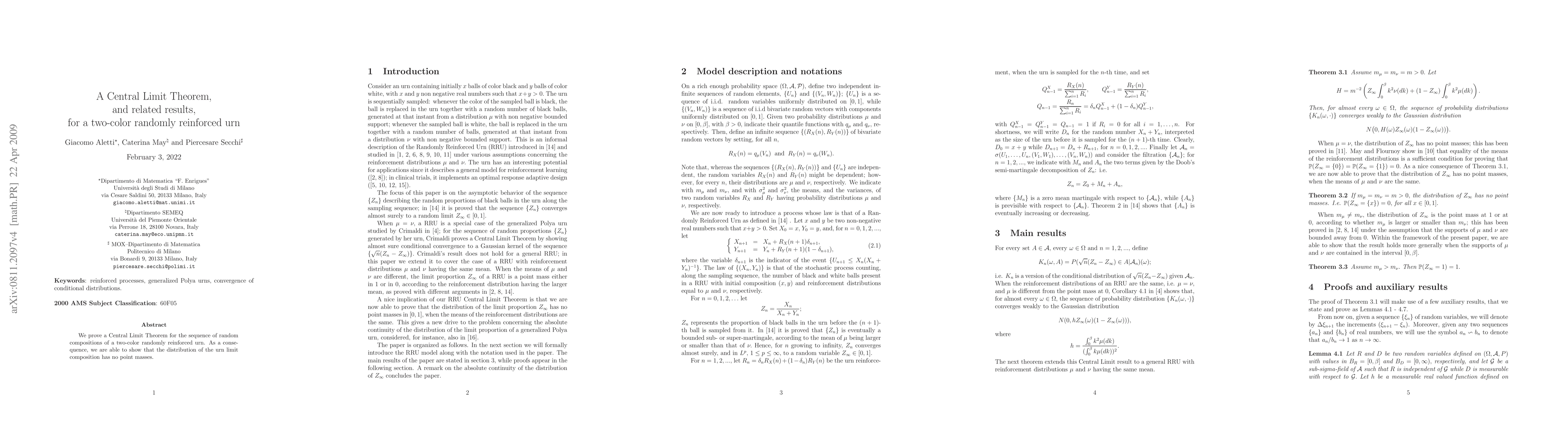 Summary: This paper establishes a Central Limit Theorem for a two-color randomly reinforced urn, demonstrating that the urn's composition distribution does not have point masses, indicating a smooth convergence behavior.