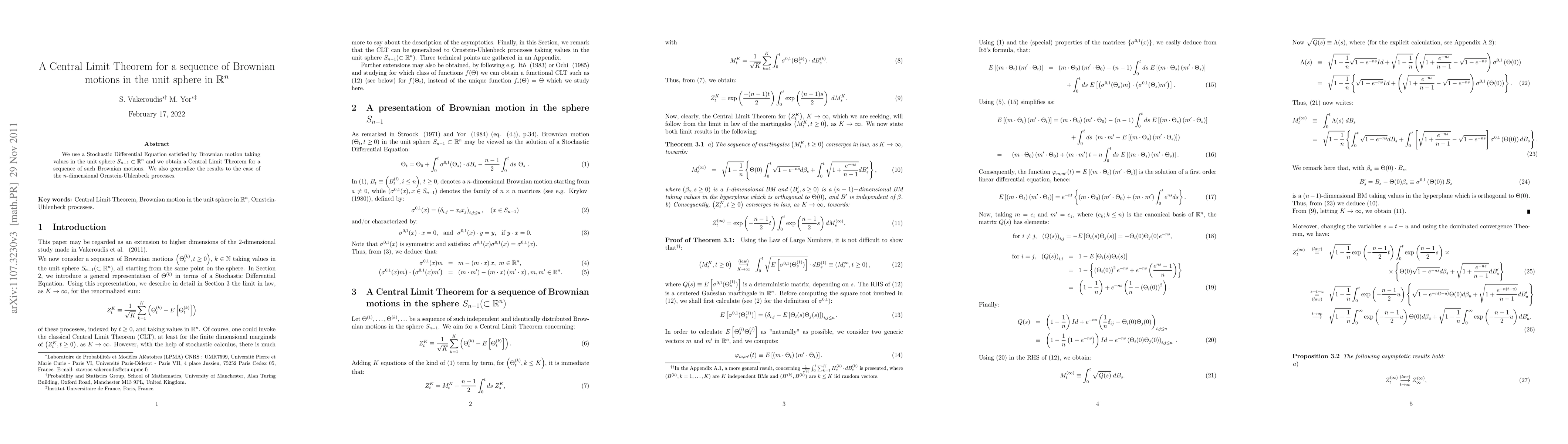 Summary: This paper establishes a Central Limit Theorem for Brownian motions confined to the unit sphere in $R^n$, using Stochastic Differential Equations. It further extends these findings to $n$-dimensional Ornstein-Uhlenbeck processes.