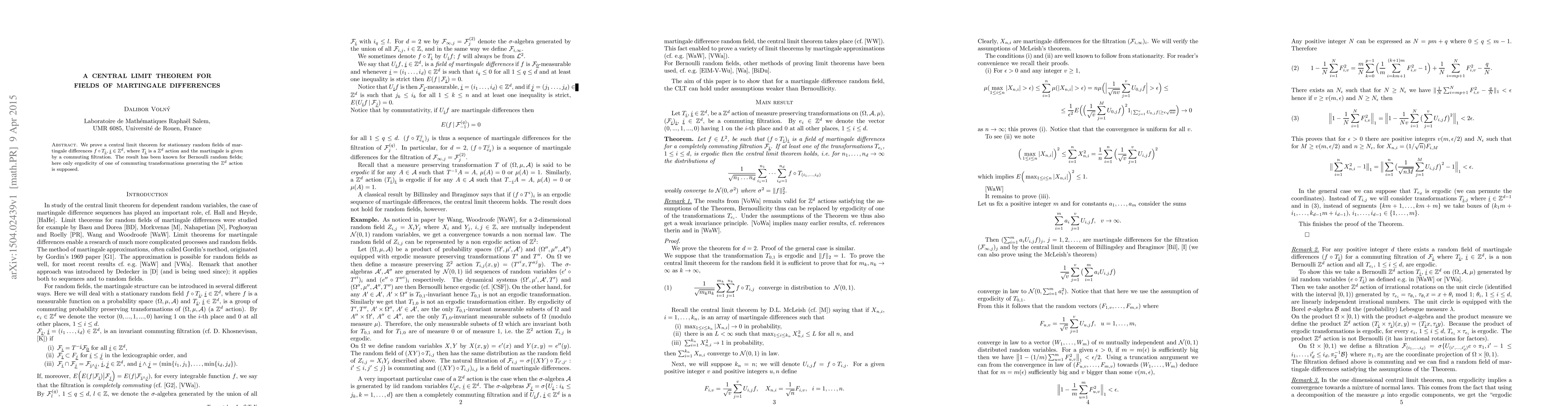 Summary: This paper establishes a central limit theorem for random fields generated by d commuting transformations, requiring only the ergodicity of one transformation, unlike previous results that needed all transformations to be Bernoulli. This extends the theorem to a broader class of processes.