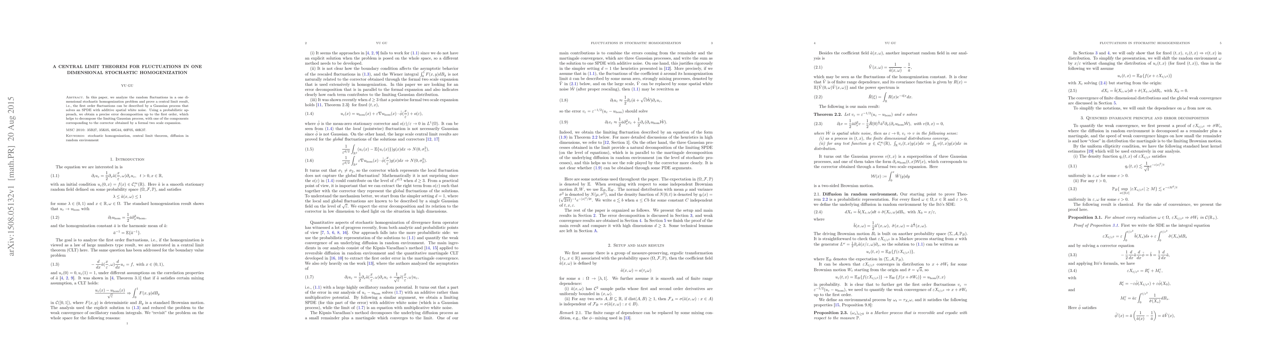 In this paper, we analyze the random fluctuations in a one dimensional stochastic homogenization problem and prove a central limit result, i.e., the first order fluctuations can be described by a Gaussian process that solves an SPDE with additive spatial white noise. Using a probabilistic approach, we obtain a precise error decomposition up to the first order, which helps to decompose the limiting Gaussian process, with one of the components corresponding to the corrector obtained by a formal two scale expansion.