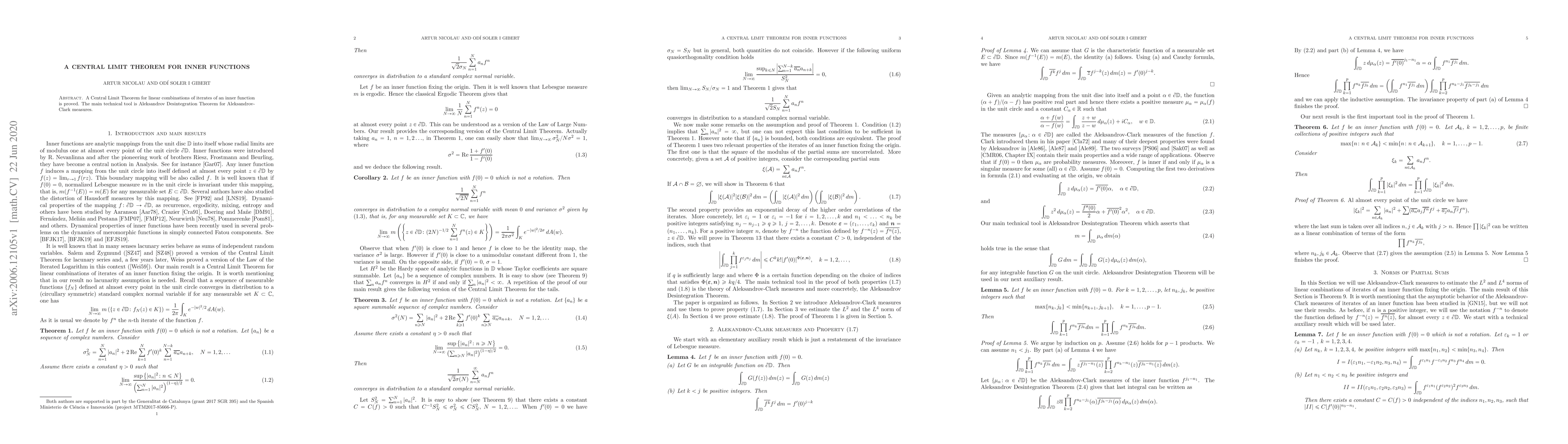 A Central Limit Theorem for linear combinations of iterates of an inner function is proved, using the Aleksandrov Desintegration Theorem for Aleksandrov-Clark measures.