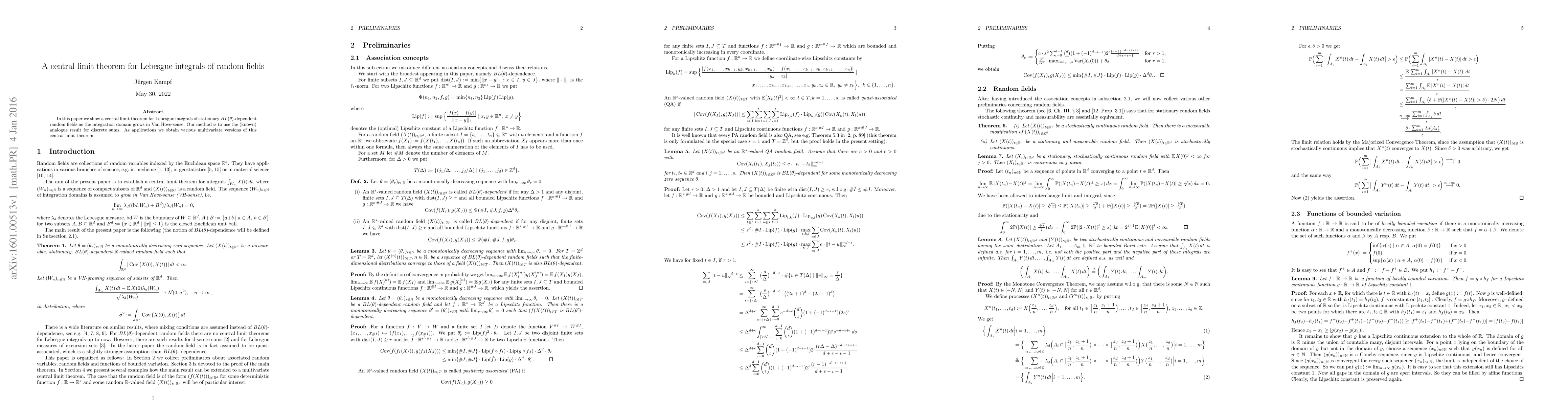 This paper establishes a central limit theorem for Lebesgue integrals of stationary $BL(\theta)$-dependent random fields as the integration domain expands in Van Hove-sense, leveraging known results for discrete sums, and provides multivariate applications of this theorem.