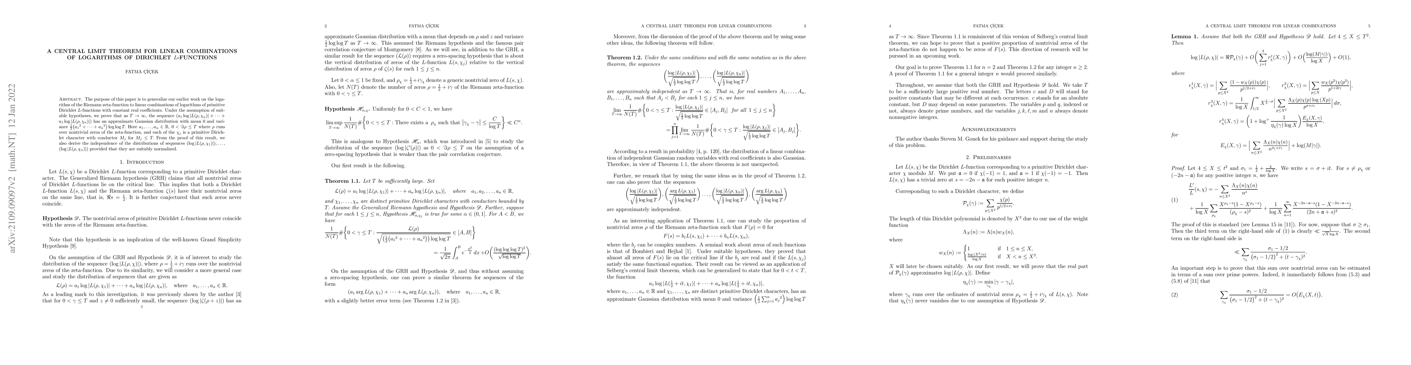 The purpose of this paper is to generalize our earlier work on the logarithm of the Riemann zeta-function to linear combinations of logarithms of primitive Dirichlet $L$-functions with constant real coefficients. Under the assumption of suitable hypotheses, we prove that as $T\to \infty $, a sequence of the form $(a_1\log|L(\rho,\chi_n)|+\dots+a_1\log|L(\rho,\chi_n)|)$ has an approximate Gaussian distribution with mean $0$ and variance $ \tfrac{1}{2}\big({a_1}^2+\dots+{a_n}^2 \big)\log\log T$. Here $a_1, \dots, a_n \in \mathbb{R}$, each of the $\chi_i$ is a primitive Dirichlet character modulo $M_i$ with $M_i\leq T$, and $0< \operatorname{Im}\rho \leq T$ where $\rho$ runs over nontrivial zeros of the zeta-function. From the proof of this result, we also derive the independence of the distributions of sequences $(\log|L(\rho,\chi_1)|), \dots, (\log|L(\rho,\chi_n)|)$ provided that they are suitably normalized.
