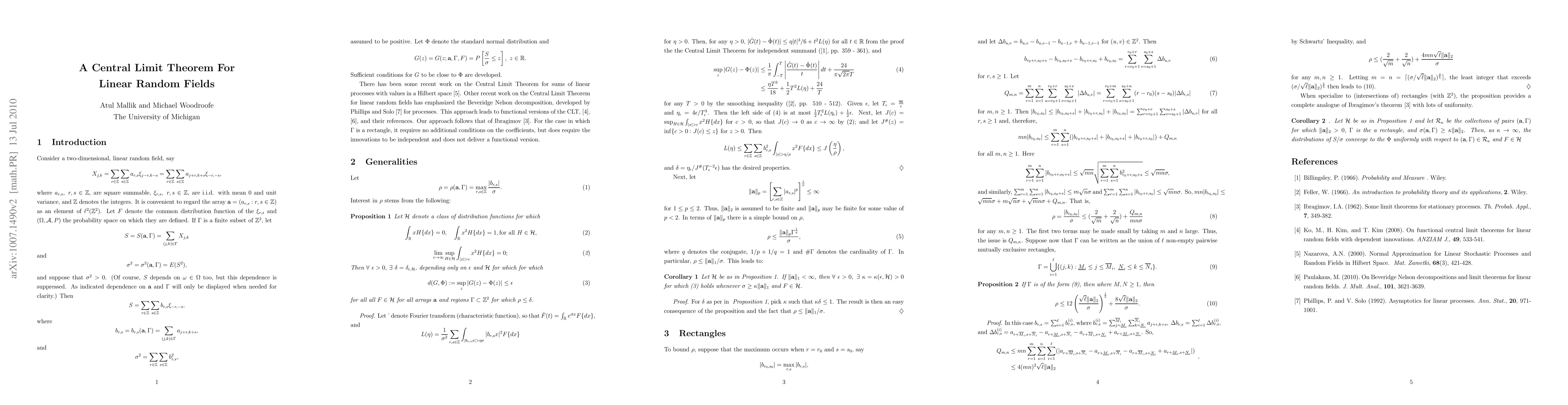 The paper presents a novel Central Limit Theorem for linear random fields based on sums over rectangles, distinct from previous approaches using Beveridge-Nelson decomposition.