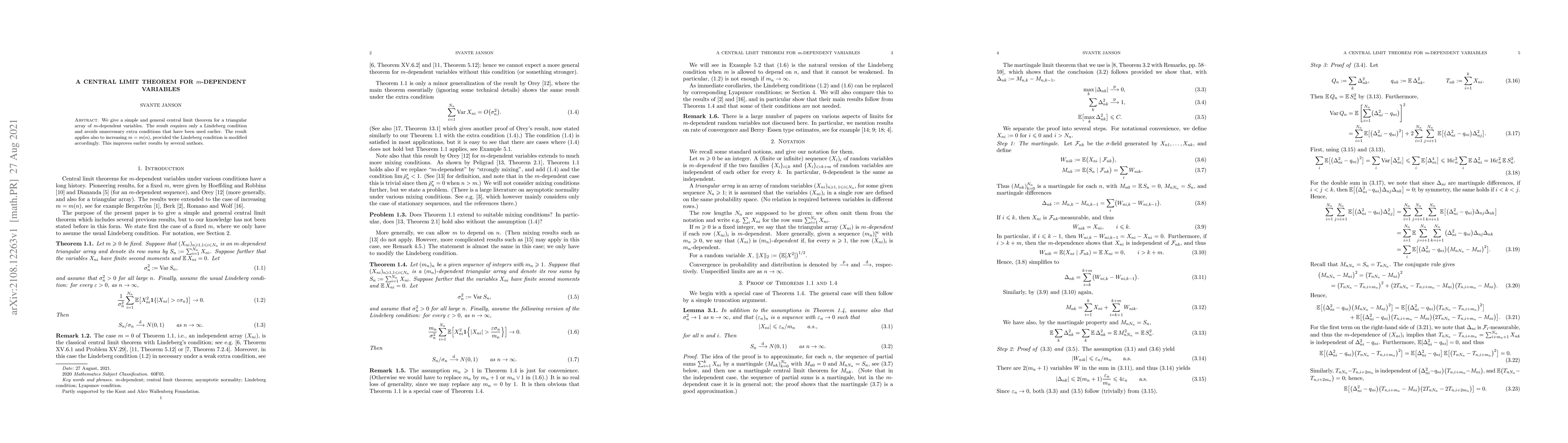 A central limit theorem is established for m-dependent variables with a simplified Lindeberg condition, improving earlier results for increasing m.