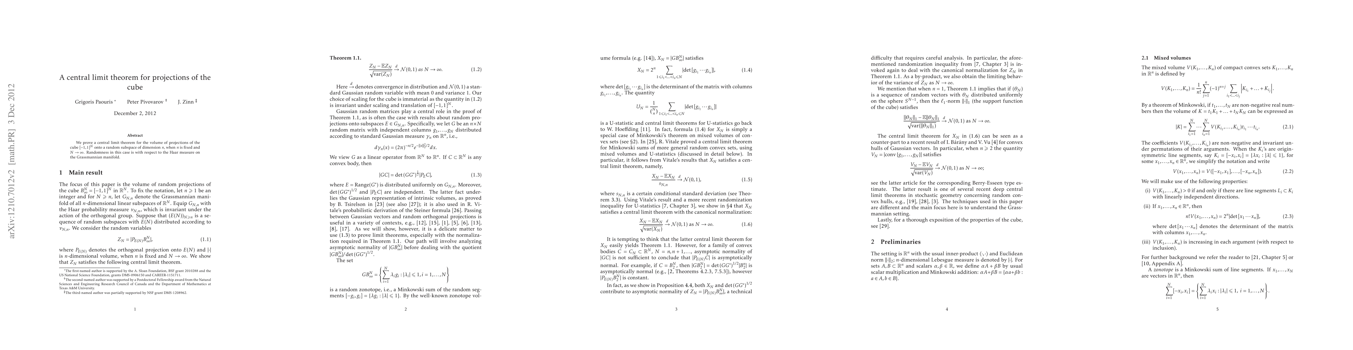 Researchers prove a central limit theorem for the volume of projections of the N-cube onto random subspaces, showing that as N increases, volumes converge to a normal distribution.