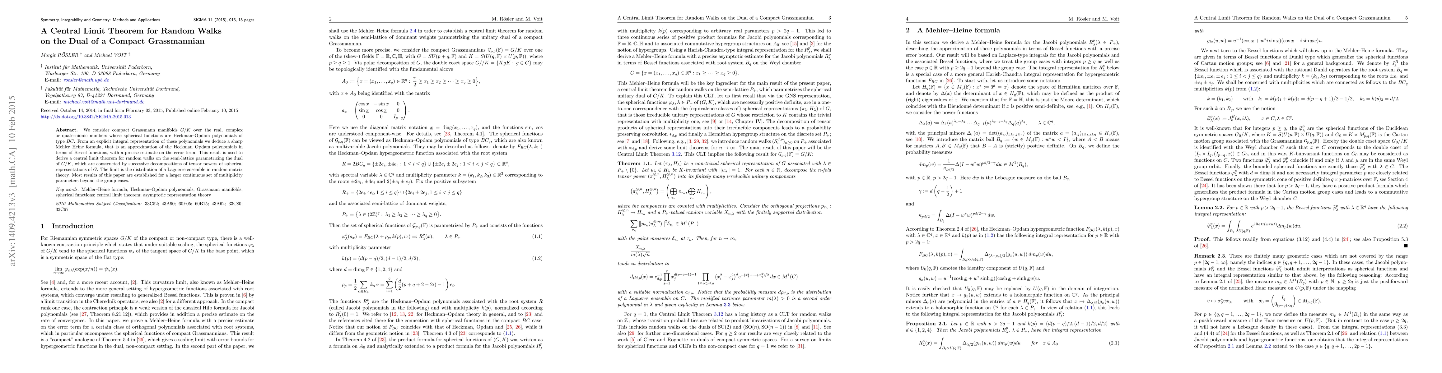 We consider compact Grassmann manifolds $G/K$ over the real, complex or quaternionic numbers whose spherical functions are Heckman-Opdam polynomials of type $BC$. From an explicit integral representation of these polynomials we deduce a sharp Mehler-Heine formula, that is an approximation of the Heckman-Opdam polynomials in terms of Bessel functions, with a precise estimate on the error term. This result is used to derive a central limit theorem for random walks on the semi-lattice parametrizing the dual of $G/K$, which are constructed by successive decompositions of tensor powers of spherical representations of $G$. The limit is the distribution of a Laguerre ensemble in random matrix theory. Most results of this paper are established for a larger continuous set of multiplicity parameters beyond the group cases.
