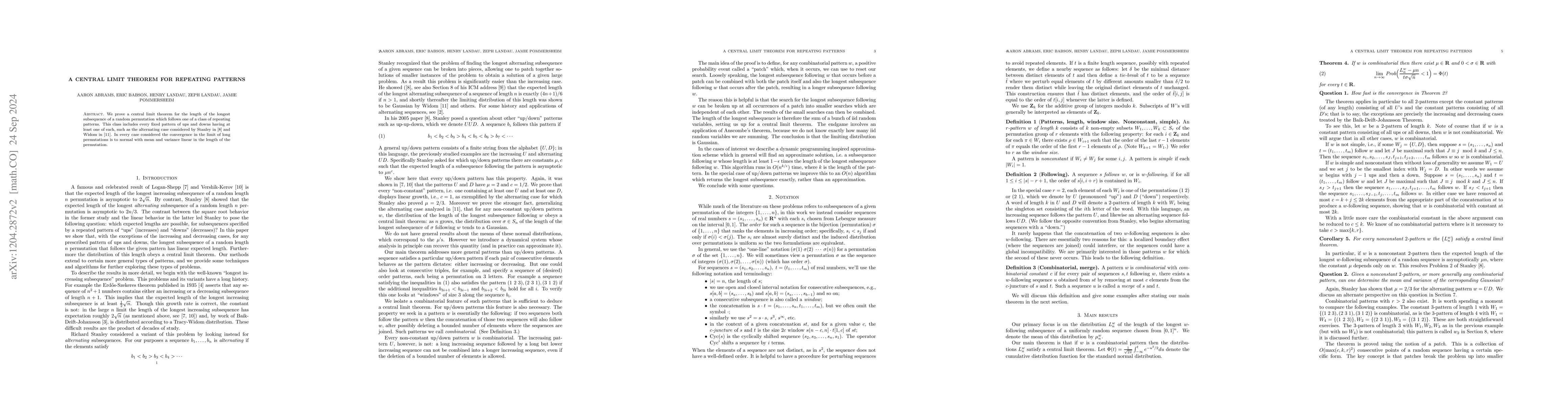 A Central Limit Theorem for Repeating Patterns in Random Permutations shows that as permutation lengths increase, the distribution of the length of the longest subsequence following a repeating pattern converges to a normal distribution with linearly increasing mean and variance.