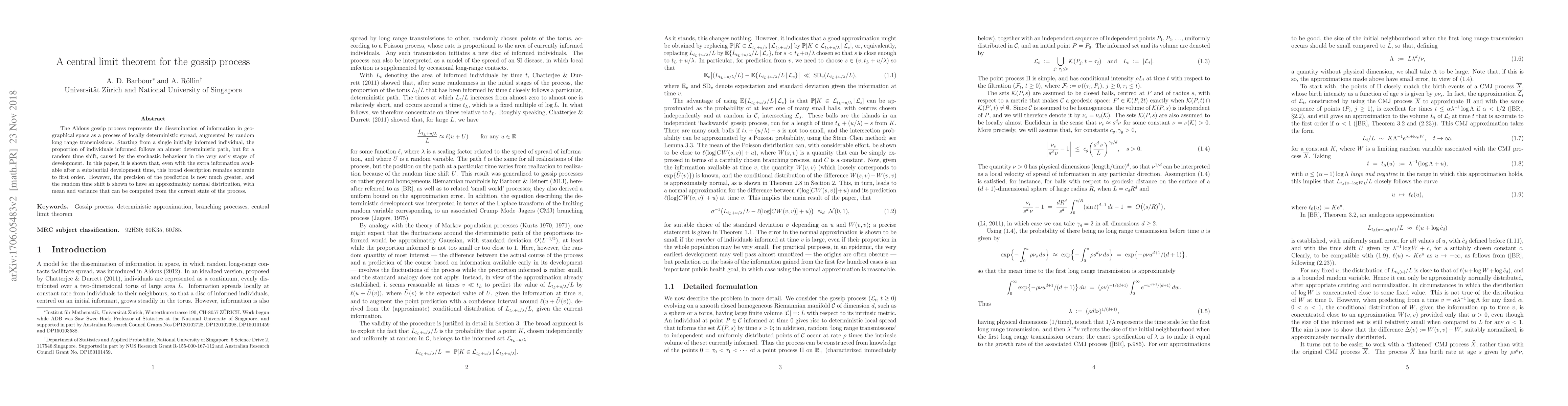 The Aldous gossip process represents the dissemination of information in geographical space as a process of locally deterministic spread, augmented by random long range transmissions. Starting from a single initially informed individual, the proportion of individuals informed follows an almost deterministic path, but for a random time shift, caused by the stochastic behaviour in the very early stages of development. In this paper, it is shown that, even with the extra information available after a substantial development time, this broad description remains accurate to first order. However, the precision of the prediction is now much greater, and the random time shift is shown to have an approximately normal distribution, with mean and variance that can be computed from the current state of the process.