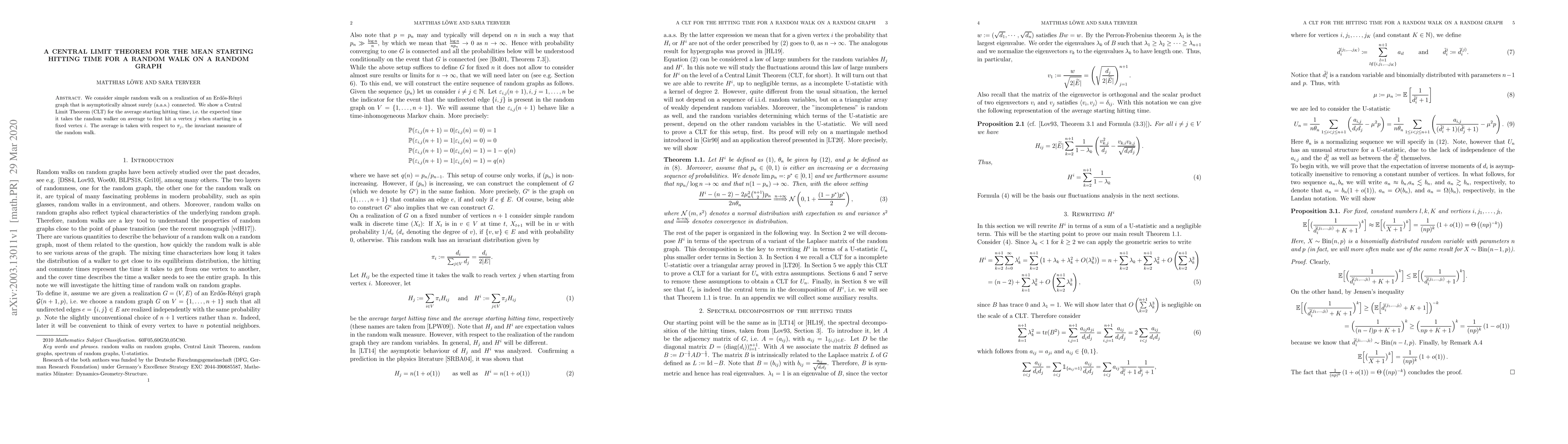 A Central Limit Theorem is established for the average starting hitting time in a random walk on an almost surely connected Erd extos-R extenyi graph, showing that this quantity converges to a normal distribution as the graph size increases.