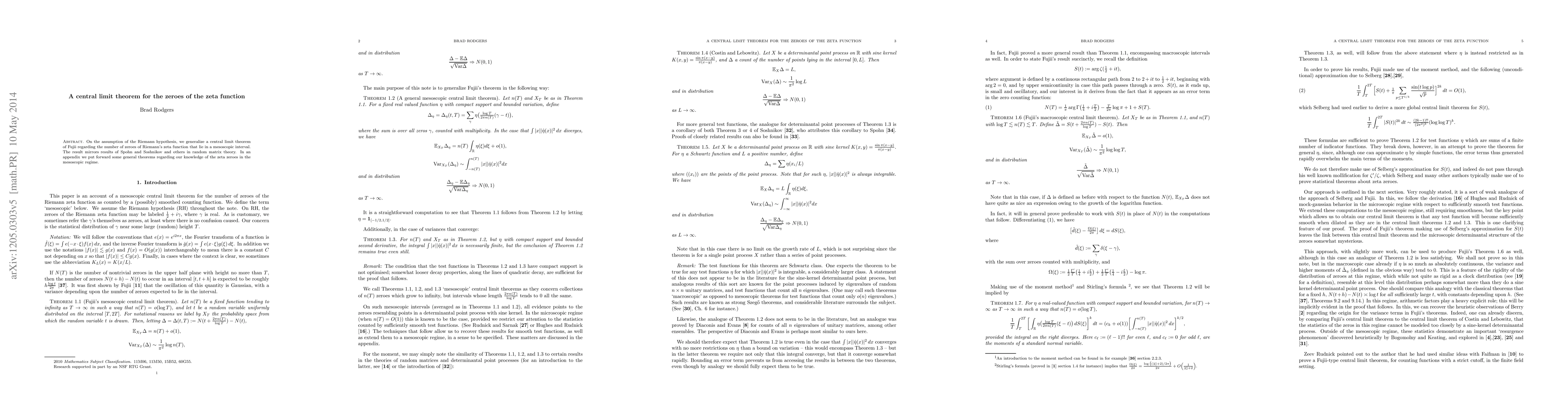 This paper generalizes a central limit theorem for the zeroes of the Riemann zeta function under the Riemann hypothesis, mirroring results from random matrix theory. An appendix provides additional theorems on the distribution of zeta zeroes in the mesoscopic interval.