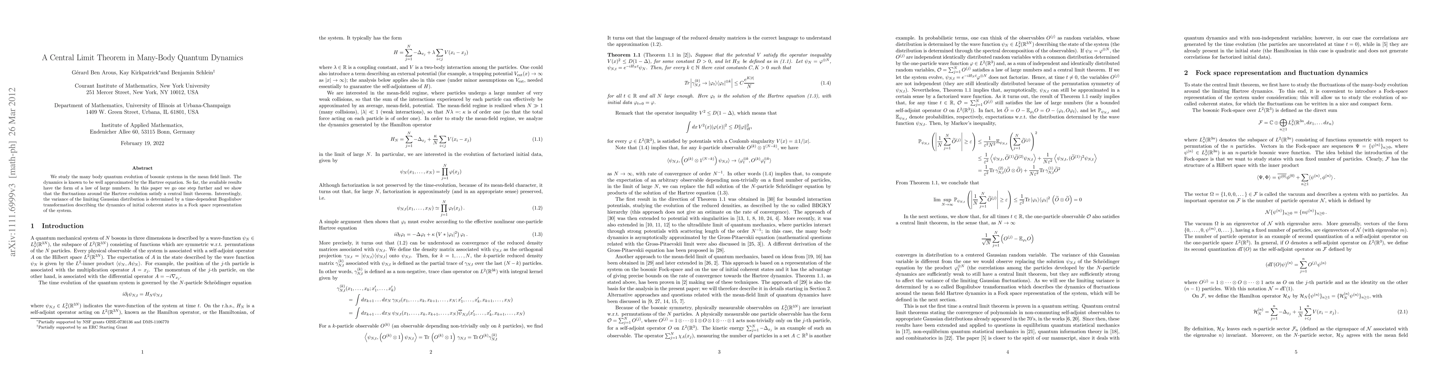 This paper demonstrates that fluctuations in the many-body quantum dynamics of bosonic systems, approximated by the Hartree equation, follow a central limit theorem. The variance of the Gaussian distribution is governed by a time-dependent Bogoliubov transformation, reflecting the dynamics of initial coherent states.