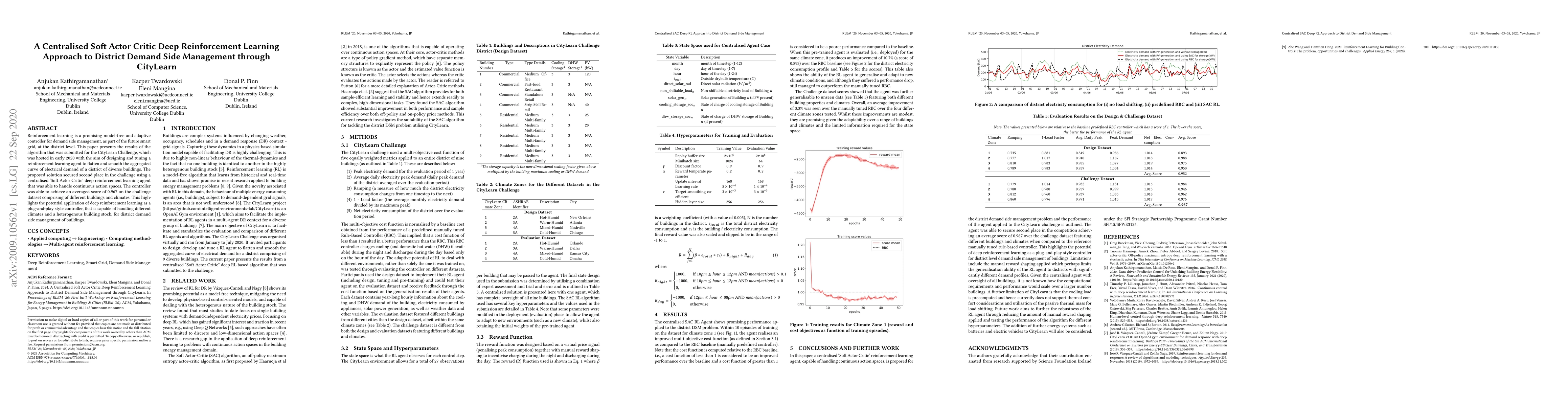 This paper proposes a centralised Soft Actor Critic deep reinforcement learning approach for district demand side management, securing second place in the CityLearn Challenge. The algorithm effectively flattens and smooths electrical demand curves, achieving an averaged score of 0.967, demonstrating its potential for managing diverse buildings and climates.