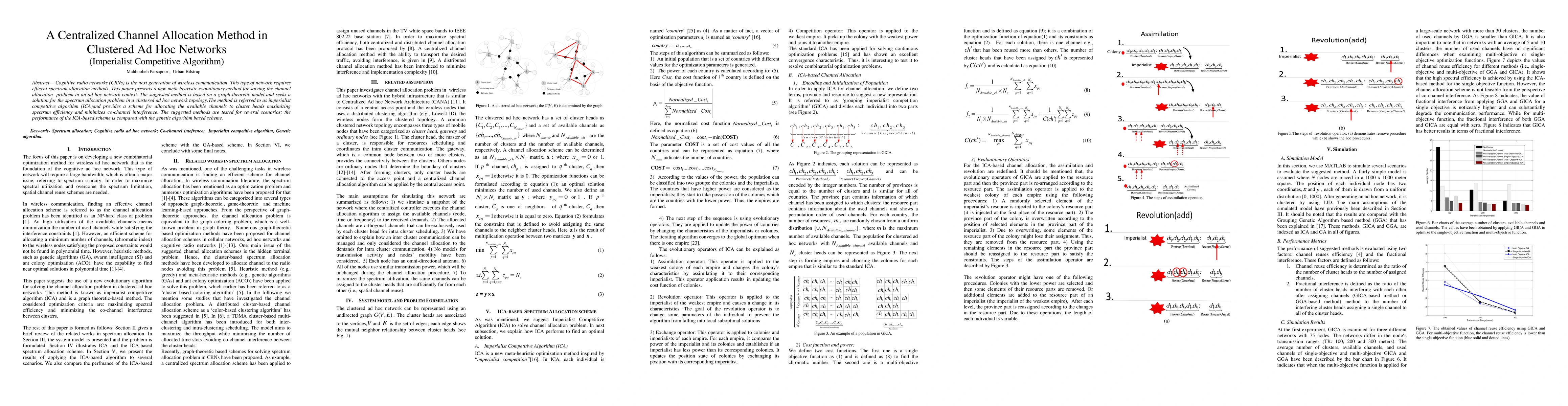 This paper proposes a novel imperialist competitive algorithm (ICA) for efficient channel allocation in clustered ad hoc networks, aiming to maximize spectrum efficiency and minimize interference. The performance of the ICA-based method is compared against a genetic algorithm-based scheme, demonstrating its effectiveness.
