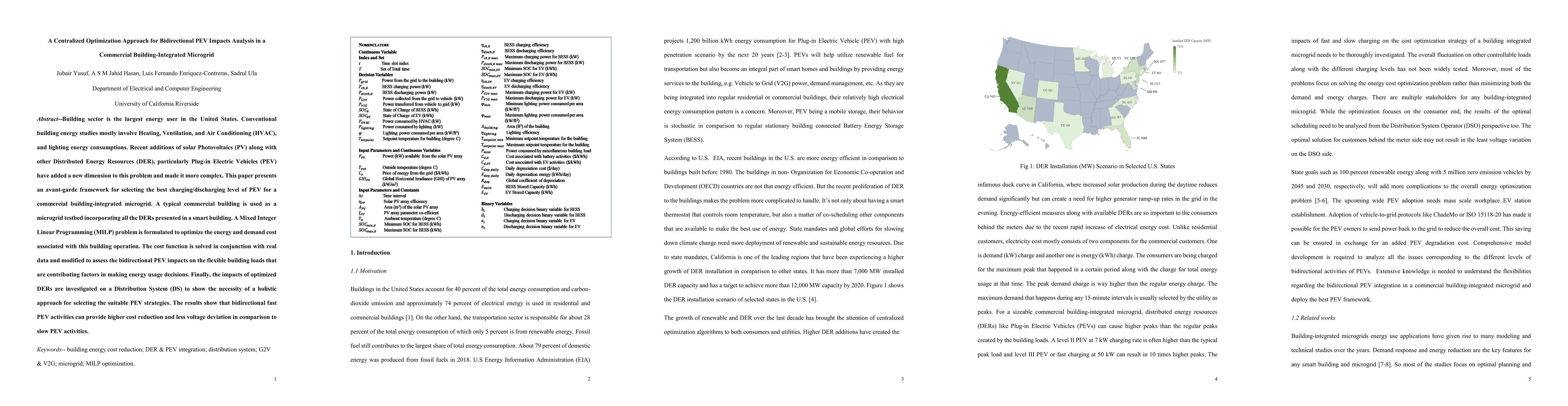 Building sector is the largest energy user in the United States. Conventional building energy studies mostly involve Heating, Ventilation, and Air Conditioning (HVAC), and lighting energy consumptions. Recent additions of solar Photovoltaics (PV) along with other Distributed Energy Resources (DER), particularly Plug-in Electric Vehicles (PEV) have added a new dimension to this problem and made it more complex. This paper presents an avant-garde framework for selecting the best charging/discharging level of PEV for a commercial building-integrated microgrid. A typical commercial building is used as a microgrid testbed incorporating all the DERs presented in a smart building. A Mixed Integer Linear Programming (MILP) problem is formulated to optimize the energy and demand cost associated with this building operation. The cost function is solved in conjunction with real data and modified to assess the bidirectional PEV impacts on the flexible building loads that are contributing factors in making energy usage decisions. Finally, the impacts of optimized DERs are investigated on a Distribution System (DS) to show the necessity of a holistic approach for selecting the suitable PEV strategies. The results show that bidirectional fast PEV activities can provide higher cost reduction and less voltage deviation in comparison to slow PEV activities.