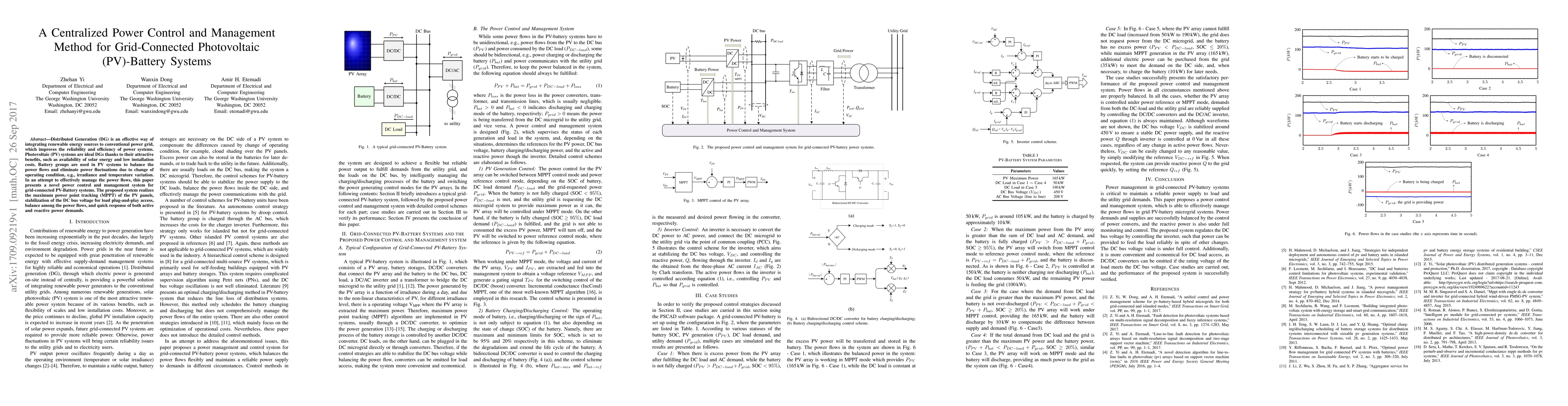 This paper introduces a centralized power control and management system for grid-connected PV-Battery systems, aiming to optimize power flow, maximize PV panel efficiency through MPPT, stabilize DC bus voltage, and balance power flows while responding quickly to active and reactive power demands.