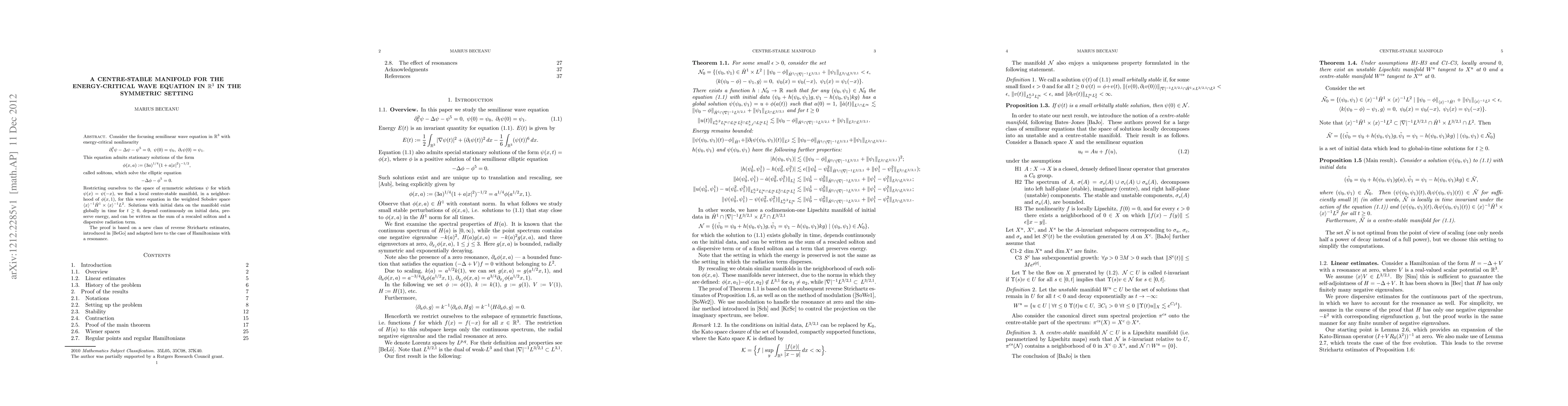 This paper establishes a local centre-stable manifold for the energy-critical wave equation in R^3 with symmetric solutions, proving global existence and continuous dependence on initial data in a specific Sobolev space. The proof leverages novel reverse Strichartz estimates adapted to handle Hamiltonians with resonance.