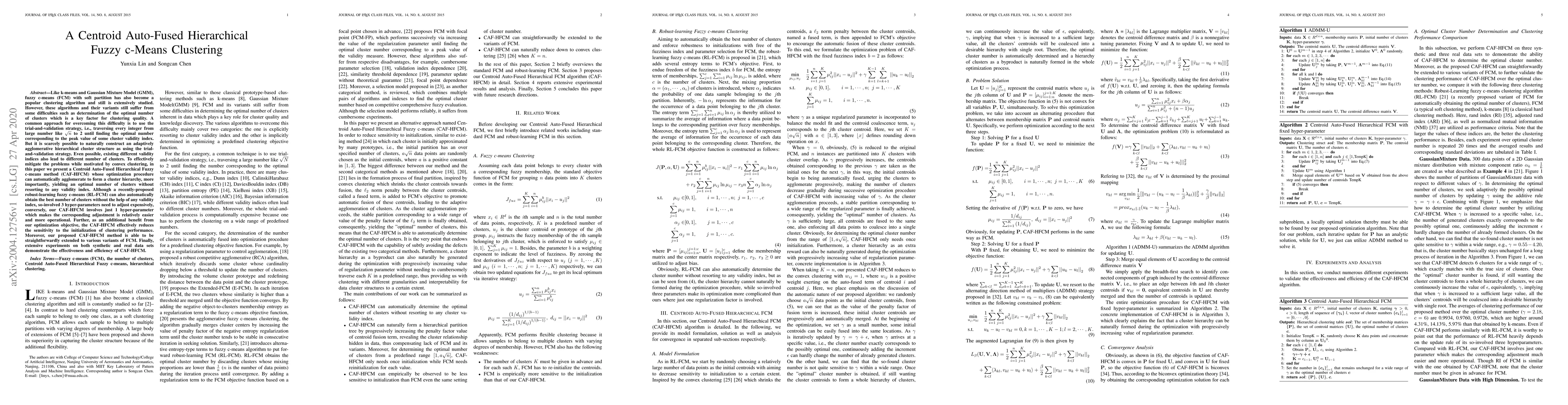 Like k-means and Gaussian Mixture Model (GMM), fuzzy c-means (FCM) with soft partition has also become a popular clustering algorithm and still is extensively studied. However, these algorithms and their variants still suffer from some difficulties such as determination of the optimal number of clusters which is a key factor for clustering quality. A common approach for overcoming this difficulty is to use the trial-and-validation strategy, i.e., traversing every integer from large number like $\sqrt{n}$ to 2 until finding the optimal number corresponding to the peak value of some cluster validity index. But it is scarcely possible to naturally construct an adaptively agglomerative hierarchical cluster structure as using the trial-and-validation strategy. Even possible, existing different validity indices also lead to different number of clusters. To effectively mitigate the problems while motivated by convex clustering, in this paper we present a Centroid Auto-Fused Hierarchical Fuzzy c-means method (CAF-HFCM) whose optimization procedure can automatically agglomerate to form a cluster hierarchy, more importantly, yielding an optimal number of clusters without resorting to any validity index. Although a recently-proposed robust-learning fuzzy c-means (RL-FCM) can also automatically obtain the best number of clusters without the help of any validity index, so-involved 3 hyper-parameters need to adjust expensively, conversely, our CAF-HFCM involves just 1 hyper-parameter which makes the corresponding adjustment is relatively easier and more operational. Further, as an additional benefit from our optimization objective, the CAF-HFCM effectively reduces the sensitivity to the initialization of clustering performance. Moreover, our proposed CAF-HFCM method is able to be straightforwardly extended to various variants of FCM.