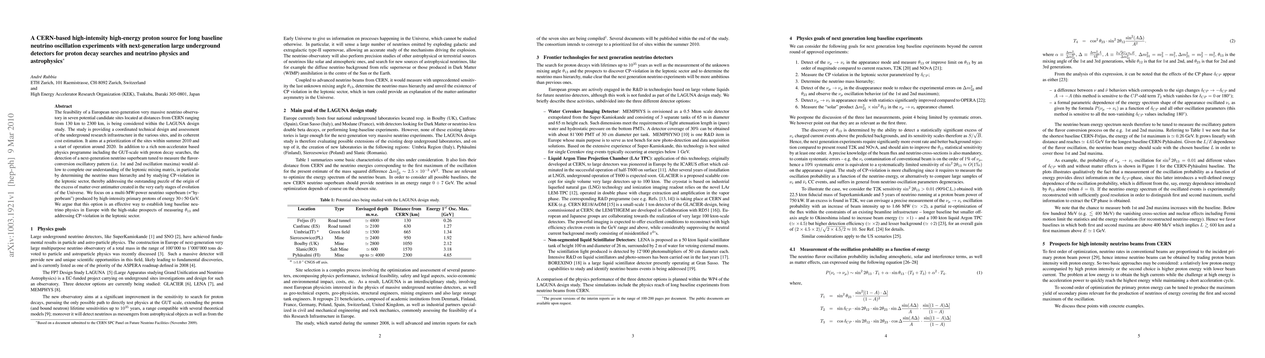 The LAGUNA design study proposes a European neutrino observatory with potential sites from 130 to 2300 km from CERN, aiming for operation by 2020. It focuses on a high-intensity, multi-MW proton beam (30-50 GeV) for long-baseline neutrino experiments, aiming to measure theta13, determine neutrino mass hierarchy, and study CP-violation in the leptonic sector, addressing the matter-antimatter asymmetry in the universe.