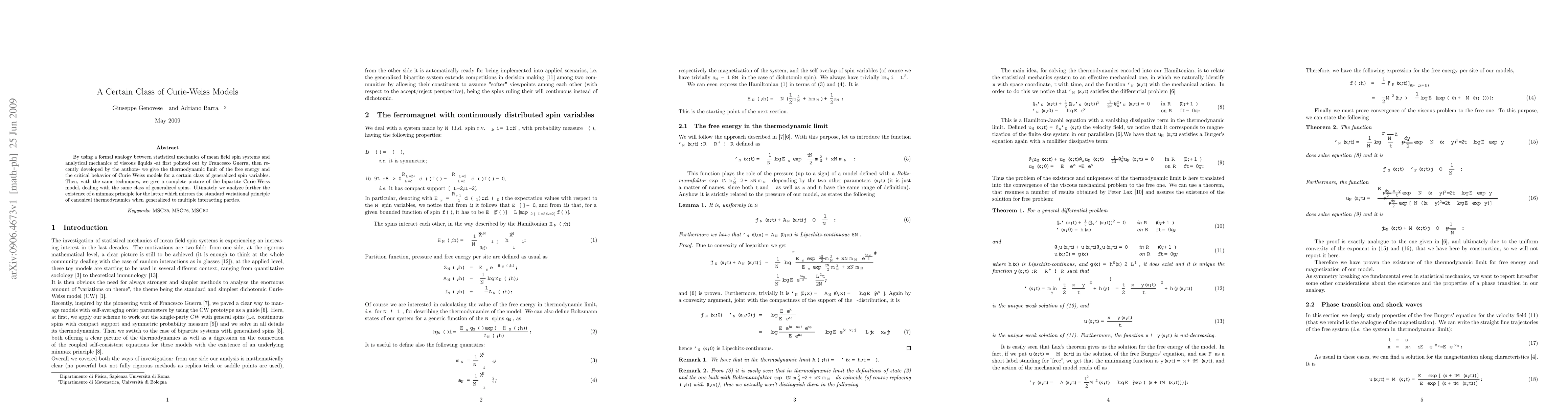 By using a formal analogy between statistical mechanics of mean field spin systems and analytical mechanics of viscous liquids -at first pointed out by Francesco Guerra, then recently developed by the authors- we give the thermodynamic limit of the free energy and the critical behavior of Curie Weiss models for a certain class of generalized spin variables. Then, with the same techniques, we give a complete picture of the bipartite Curie-Weiss model, dealing with the same class of generalized spins. Ultimately we analyze further the existence of a minmax principle for the latter which mirrors the standard variational principle of canonical thermodynamics when generalized to multiple interacting parties.