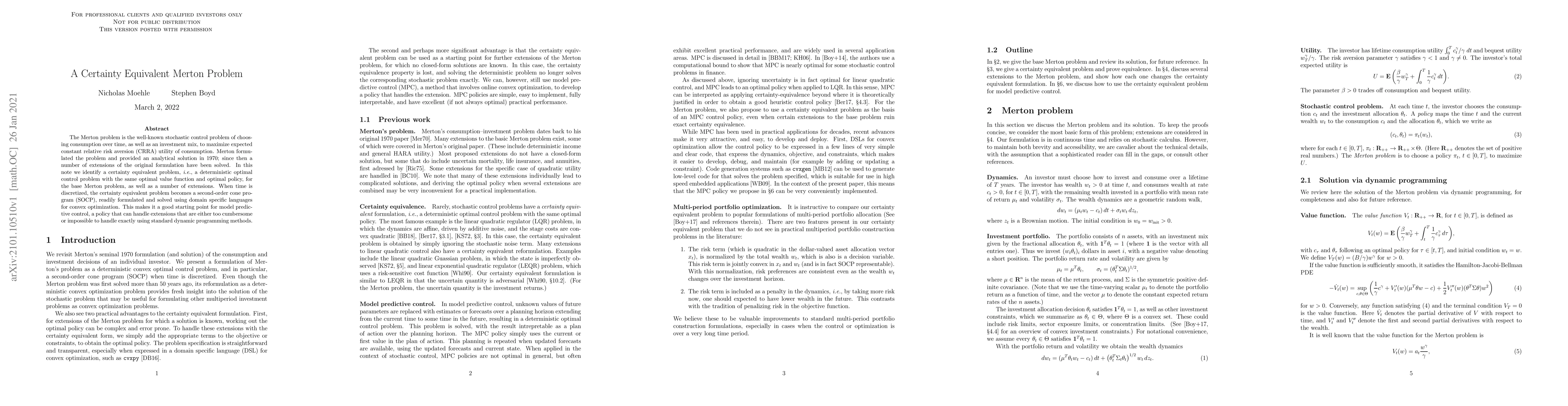The Merton problem is the well-known stochastic control problem of choosing consumption over time, as well as an investment mix, to maximize expected constant relative risk aversion (CRRA) utility of consumption. Merton formulated the problem and provided an analytical solution in 1970; since then a number of extensions of the original formulation have been solved. In this note we identify a certainty equivalent problem, i.e., a deterministic optimal control problem with the same optimal value function and optimal policy, for the base Merton problem, as well as a number of extensions. When time is discretized, the certainty equivalent problem becomes a second-order cone program (SOCP), readily formulated and solved using domain specific languages for convex optimization. This makes it a good starting point for model predictive control, a policy that can handle extensions that are either too cumbersome or impossible to handle exactly using standard dynamic programming methods.