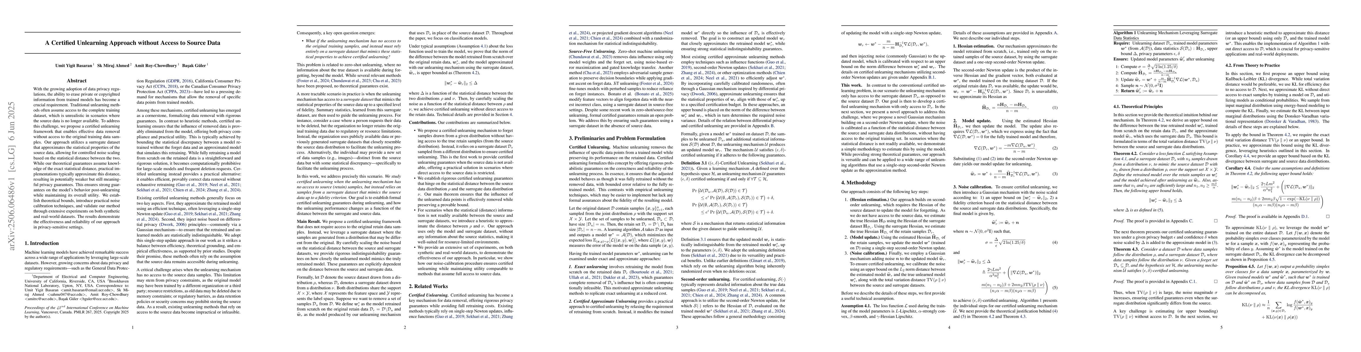 With the growing adoption of data privacy regulations, the ability to erase private or copyrighted information from trained models has become a crucial requirement. Traditional unlearning methods often assume access to the complete training dataset, which is unrealistic in scenarios where the source data is no longer available. To address this challenge, we propose a certified unlearning framework that enables effective data removal \final{without access to the original training data samples}. Our approach utilizes a surrogate dataset that approximates the statistical properties of the source data, allowing for controlled noise scaling based on the statistical distance between the two. \updated{While our theoretical guarantees assume knowledge of the exact statistical distance, practical implementations typically approximate this distance, resulting in potentially weaker but still meaningful privacy guarantees.} This ensures strong guarantees on the model's behavior post-unlearning while maintaining its overall utility. We establish theoretical bounds, introduce practical noise calibration techniques, and validate our method through extensive experiments on both synthetic and real-world datasets. The results demonstrate the effectiveness and reliability of our approach in privacy-sensitive settings.