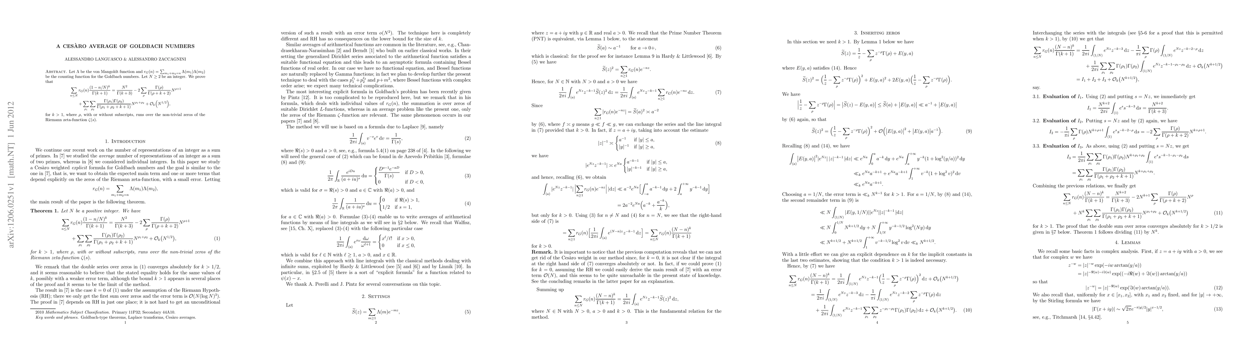 Let $\Lambda$ be the von Mangoldt function and $(r_G(n) = \sum_{m_1 + m_2 = n} \Lambda(m_1) \Lambda(m_2))$ be the counting function for the Goldbach numbers. Let $N \geq 2$ be an integer. We prove that $$\begin{align} &\sum_{n \le N} r_G(n) \frac{(1 - n/N)^k}{\Gamma(k + 1)} = \frac{N^2}{\Gamma(k + 3)} - 2 \sum_\rho \frac{\Gamma(\rho)}{\Gamma(\rho + k + 2)} N^{\rho+1}\\ &\qquad+ \sum_{\rho_1} \sum_{\rho_2} \frac{\Gamma(\rho_1) \Gamma(\rho_2)}{\Gamma(\rho_1 + \rho_2 + k + 1)} N^{\rho_1 + \rho_2} + \mathcal{O}_k(N^{1/2}), \end{align}$$ for $k > 1$, where $\rho$, with or without subscripts, runs over the non-trivial zeros of the Riemann zeta-function $\zeta(s)$.