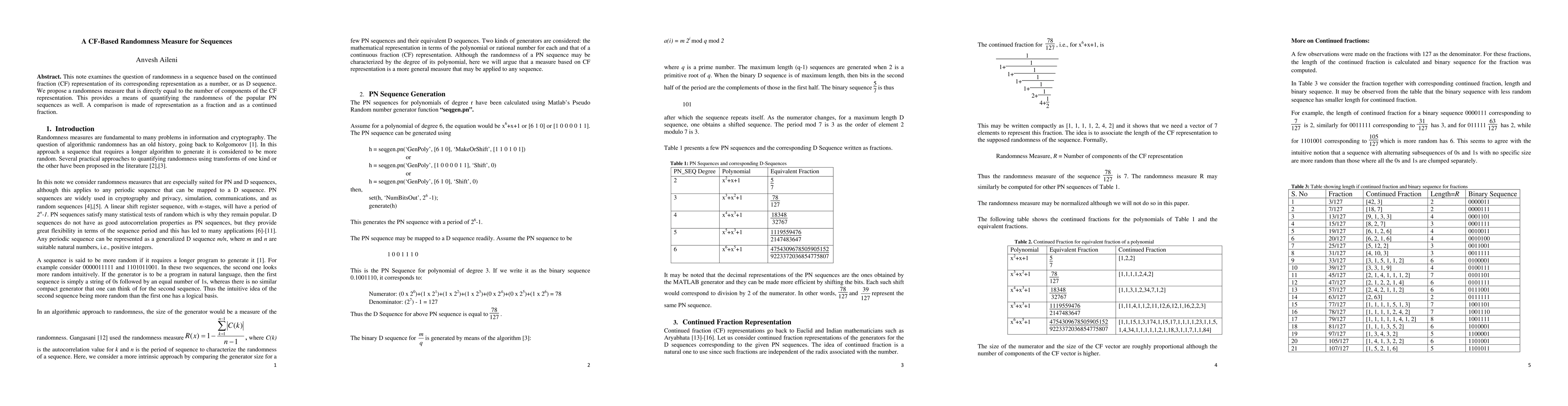 This note examines the question of randomness in a sequence based on the continued fraction (CF) representation of its corresponding representation as a number, or as D sequence. We propose a randomness measure that is directly equal to the number of components of the CF representation. This provides a means of quantifying the randomness of the popular PN sequences as well. A comparison is made of representation as a fraction and as a continued fraction.