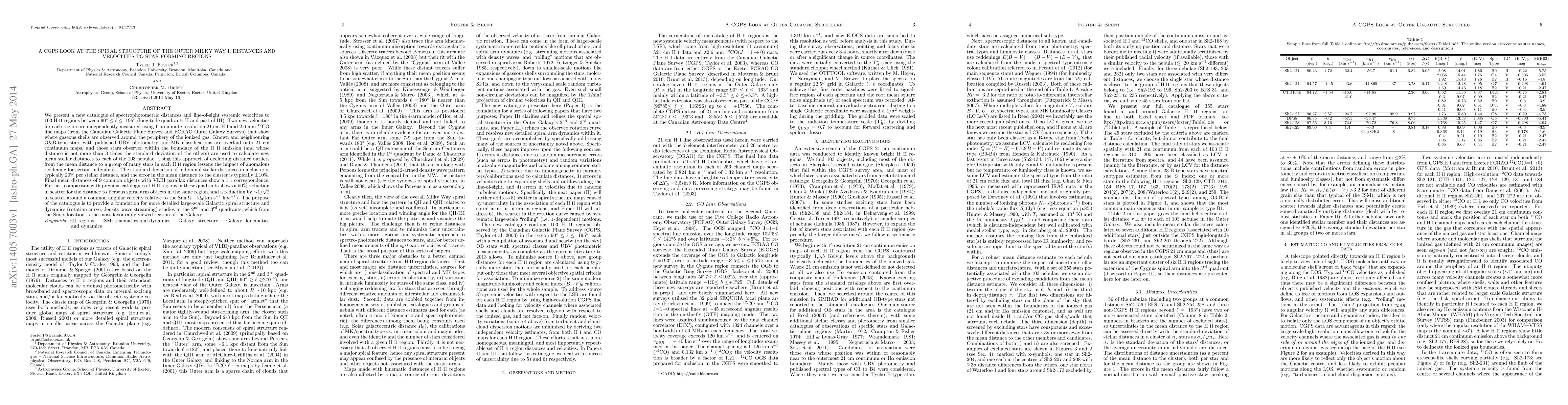 The paper presents a new catalogue of distances and velocities for 103 HII regions in the Milky Way's outer quadrants II and III. Utilizing the Canadian Galactic Plane Survey and FCRAO Outer Galaxy Surveys, the study measures velocities and calculates distances using nearby OB-type stars. The method excludes outlier distances, reducing scatter in distance measurements for Perseus spiral arm objects by 50%. This work lays the groundwork for detailed studies on Galactic spiral structure and dynamics in these quadrants.