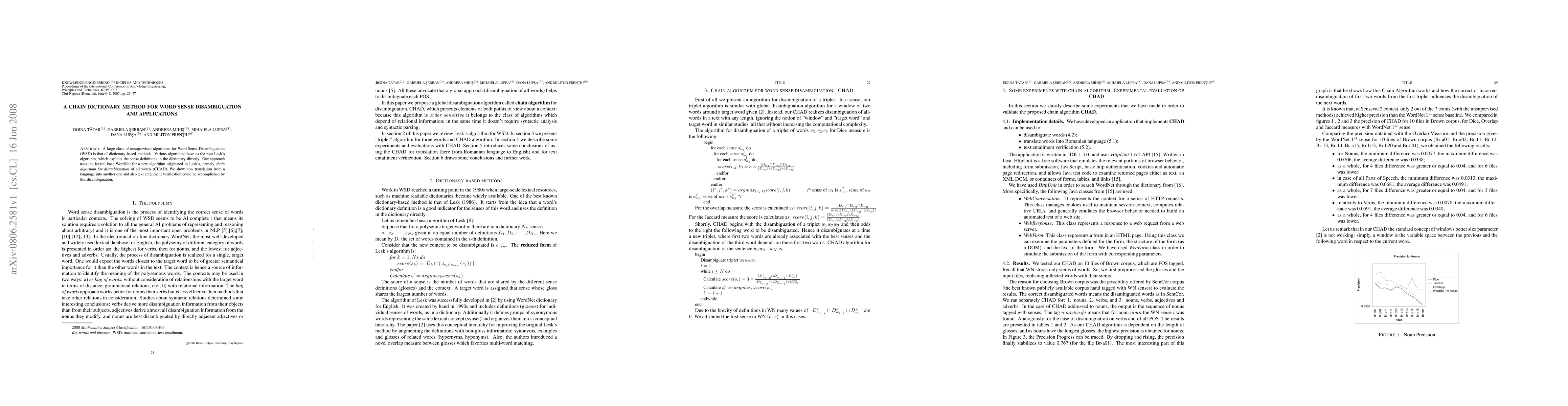 This paper introduces a new unsupervised Word Sense Disambiguation (WSD) method called the "chain algorithm for disambiguation of all words" (CHAD), which leverages WordNet and extends Lesk's algorithm. The authors demonstrate the utility of CHAD in language translation and text entailment verification.